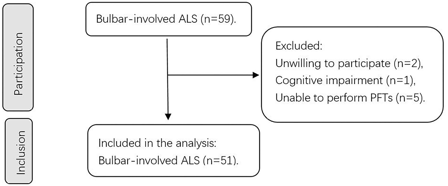 This prospective study was conducted between 1 October 2020, and 30 November 2021, at the Peking University Third Hospital, Beijing, China. The study invited 59 patients with bulbar-involved ALS who fulfilled the revised El Escorial criteria for definite, probable, lab-supported probable and possible ALS (7). The exclusion criteria included (1) concomitant presence of severe complications (i.e., organ failure), (2) the inability to perform PFTs (i.e., after ophthalmologic surgeries; severe weakness of facial and oral muscles), (3) concomitant presence of respiratory diseases (i.e., chronic obstructive pulmonary disease and asthma), and (4) cognitive impairment or psychiatric disorders. Bulbar-involved ALS is defined as ALS with at least 1 clinical symptom indicating bulbar function impairment, including dysphagia, dysarthria, bucking, sialorrhea, and forced crying or laughter. At least 2 experienced doctors performed assessments for every participant. After assessing the eligibility based on the strict criteria listed above, 51 patients were finally included in the study. The institutional ethics committee of Peking University Third Hospital approved this study. Figure 1 shows a flow chart of the sample selection process in our study.