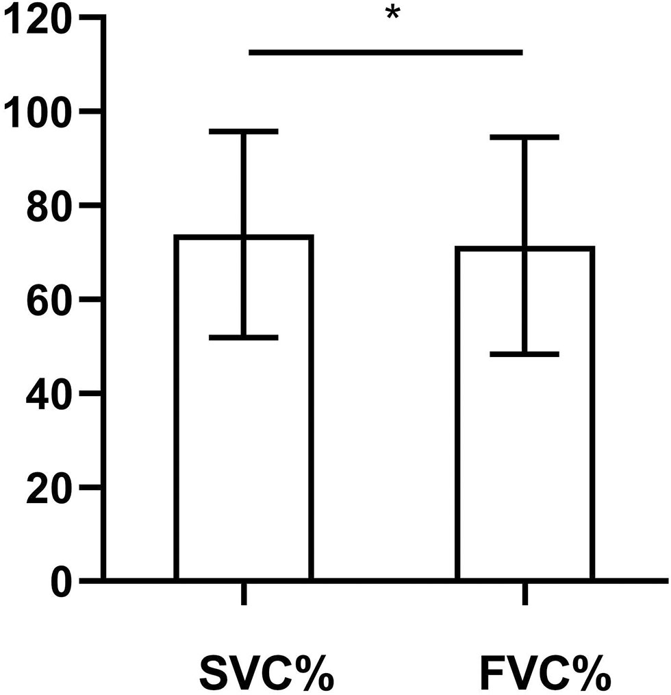 Comparison of SVC% and FVC% in bulbar-involved ALS (n = 51). SVC% (73.82 ± 21.95) was significantly higher than FVC% (71.42 ± 23.15). SMD = 0.51. p = 0.013. SVC%, percent predicted SVC values; FVC%, percent predicted FVC values; ALS, amyotrophic lateral sclerosis; SMD, standardized mean difference. *p < 0.05.