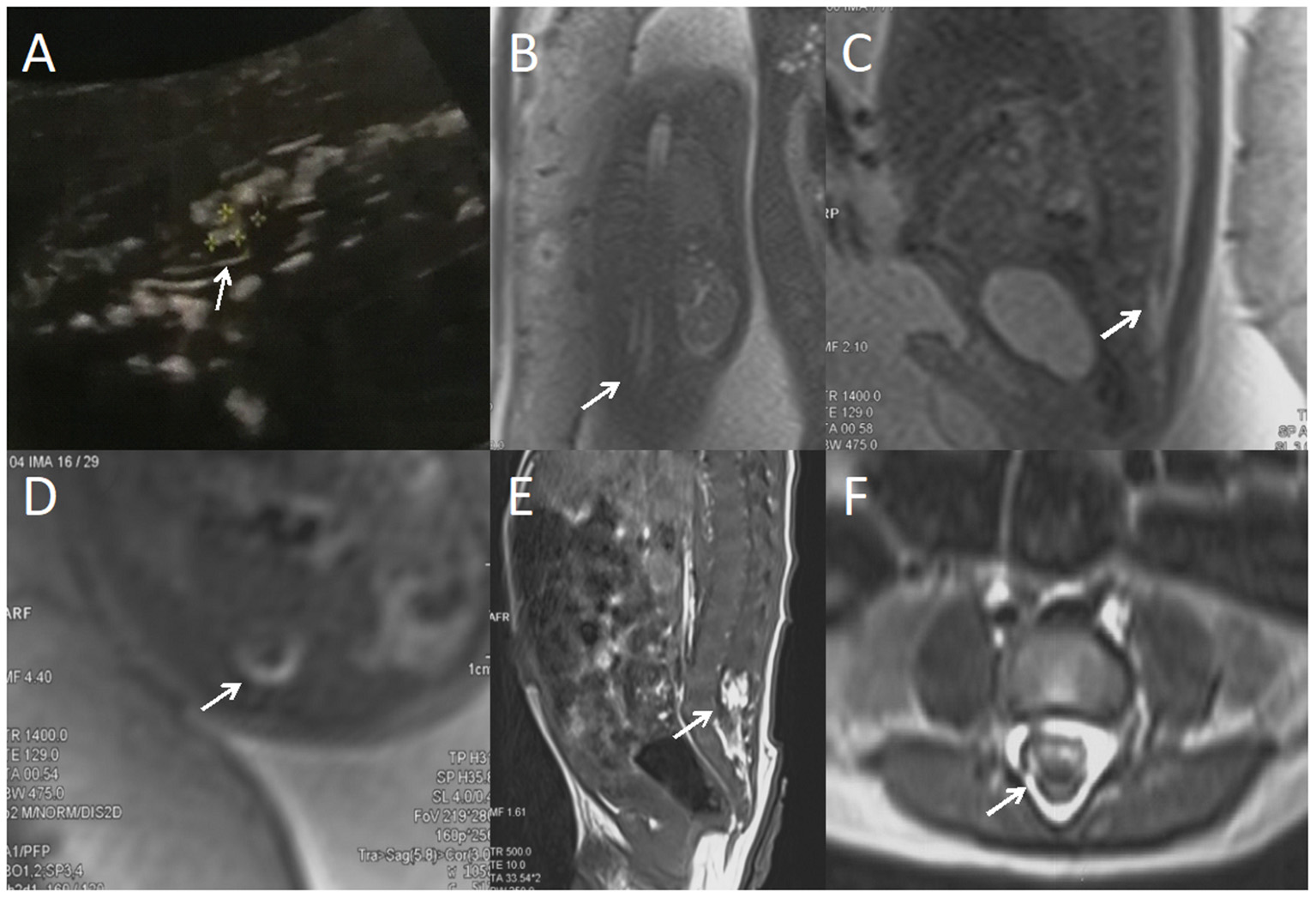 A fetus with intraspinal lipoma. (A) the prenatal ultrasound examination at 24 weeks of gestation showed the presence of low conus medullosus in the fetus, hyperechoic mass shadow in the spinal canal, and broken spinal continuity. Thus, spina bifida and intraspinal lipoma were considered. (B) Fetal magnetic resonance imaging (MRI) examination at 24 + 2 weeks of gestation showed a coronal view of the low conus medullosus of the fetus, with enlarged end of the conus medullosus and tight adhesion to the posterior edge of the spinal canal. (C) Sagittal view showed the low conus of fetal myeloma cord. (D) In the axial position, normal subarachnoid space in the spinal canal disappeared, with lipoma and spinal nerves mixed. (E) T1 sagittal MRI of the lumbosacral vertebrae 10 days after birth suggested intraspinal lipoma. (F) Axial MRI of the lumbosacral vertebrae showed uneven internal signal of lipoma, which was considered to be a hybrid lipoma with the spinal nerves.