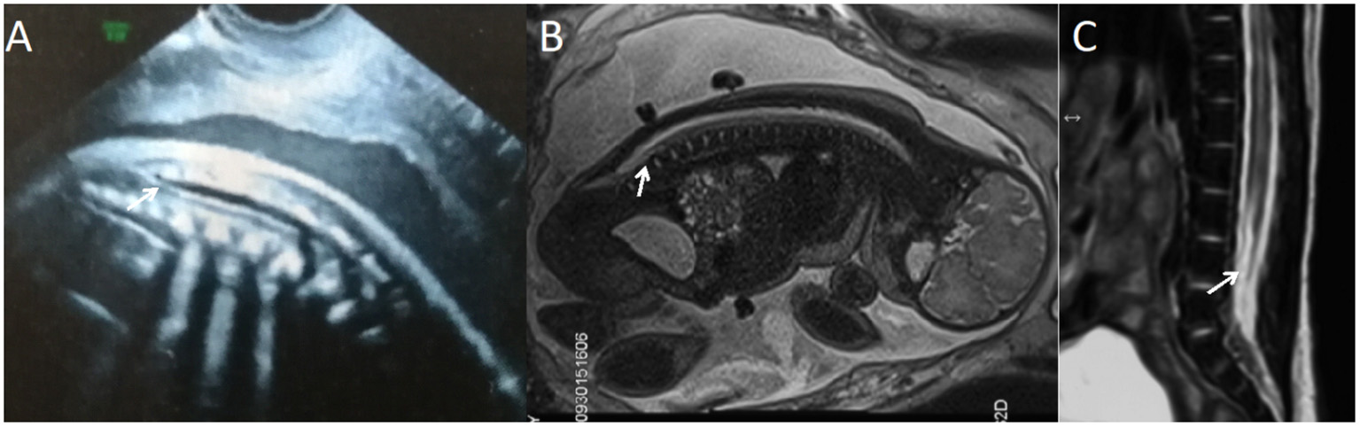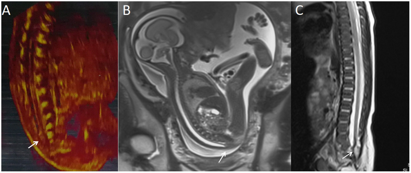A fetus with intraspinal lipoma. (A) The prenatal ultrasound examination at 25 + 1 weeks of gestation showed the presence of low conus medullosus in the fetus and hyperechoic mass shadow in the spinal canal. Thus, intraspinal lipoma was considered. (B) Fetal magnetic resonance imaging (MRI) examination at 25 + 2 weeks of gestation showed the low conus medullosus of the fetus, with enlarged end of the conus medullosus and conus terminal and dural sac caudal adhesion. (C) T2 sagittal MRI of the lumbosacral vertebrae 20 days after birth suggested spina bifida and intraspinal lipoma.