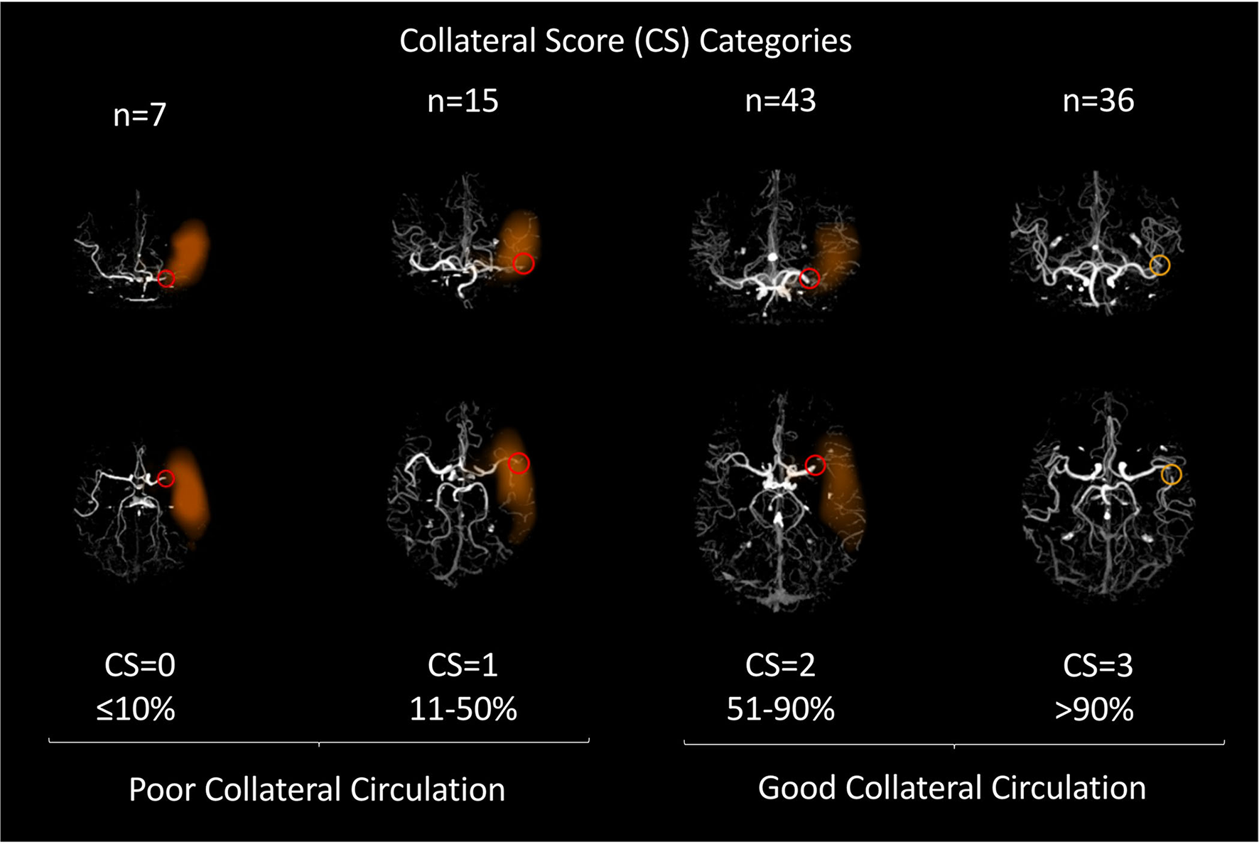 Selected images of our patients processed with e-Stroke (Brainomix Ltd.) are shown as illustrative examples for each CS: 0, collateral filling of ≤10% of the occluded MCA territory; 1, 11–50%; 2, 51–90%; 3, >90%. The first row shows the number of patients in each group in our study. The orange area indicates the area without collateral circulation, the red circle indicates the location of the arterial occlusion.