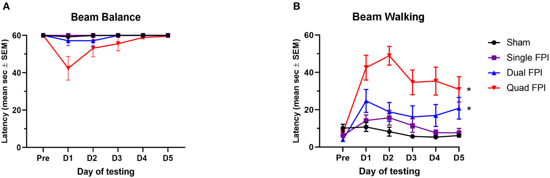 Testing of acute vestibular motor function was completed in the first 5 days following the final FPI to determine how motor functioning is affected by rmFPI, and how the degree of impairment is affected by number of injuries. The beam balance task revealed no significant differences in balance latencies over the 5 day testing period (repeated measures one-way ANOVA; p = 0.2184; Figure 1A). The beam walking task revealed significant differences in the latencies over the testing period between the groups (repeated measures one-way ANOVA; main group effect *p < 0.0005, F (1.245, 4.979) = 88.83; Figure 1B). Latencies of dFPI and qFPI were significantly different from the combined sham group (post-hoc test, *p < 0.001; Figure 1B). All injured groups (sFPI, dFPI, and qFPI) were significantly different from each other over the 5 day testing period (post-hoc test, p < 0.05).