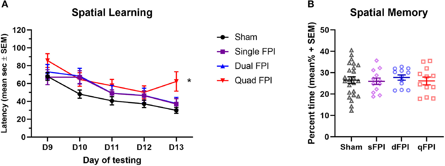 Quad FPI results in impaired spatial learning performance on days 9–13 post-injury. Analysis performed with sham groups (dSh and qSh) combined. (A) Assessment of spatial learning on days 9–13 post-injury revealed significantly different performances between groups (repeated measures one-way ANOVA; main group effect p < 0.05). Learning latencies showed a significant increase in qFPI compared to combined shams over the 5 day testing period (post-hoc test, *p < 0.05). dFPI showed a modest trend in increased latencies compared to the sham group (post-hoc test, p = 0.0565). (B) Assessment of spatial memory using the hidden probe trail on day 14 revealed no significant differences in latencies between the groups.