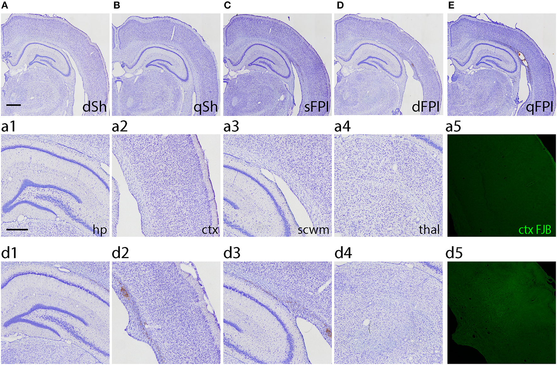 Increasing frequency of injury produces histopathology 2 weeks post-injury. Representative images of dSh (A), qSh (B), sFPI (C), dFPI (D), and qFPI (E) Cresyl violet stained sections are shown (total of n = 6 per group), scale bar equal to 1 mm. QFPI led to visible tissue damage, including hemorrhage at the interface of the gray matter and white matter, as compared to shams, sFPI, and dFPI. Representative higher magnification images of those shown in dSh (B) and dFPI (D) show the ipsilateral hippocampus, cortex, subcortical white matter, and thalamus of the Cresyl violet-stained dSh (a1–a4) and dFPI (d1–d4), scale bar equal to 500 μm (d3). DFPI led to minimal tissue damage compared to dSh, however it did lead to mild hemorrhaging in the subcortical white matter. Staining with the neurodegenerative marker Fluoro-Jade B revealed positive neurons in the cortex following dFPI, but not following dFPI (a5,d5).