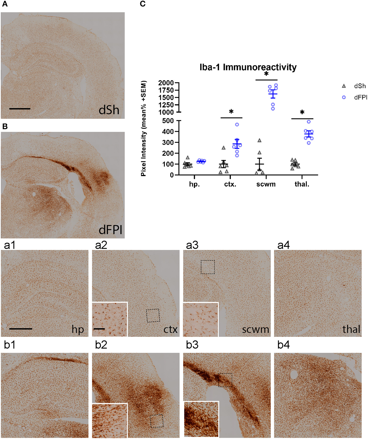 Dual FPI results in increased Iba-1 abundance in the cortex, thalamus, and subcortical white matter 2 weeks post-injury. Representative images of Iba-1 immunoreactivity in the ipsilateral hemisphere at 14 days following dSh (A) and dFPI (B) are shown (total of n = 6 per group), scale bar equal to 1 mm. Representative higher magnification images collected from dSh (A) and dFPI (B) highlight Iba-1 subregional immunoreactivity in the dSh ipsilateral hippocampus (a1), cortex (a2), subcortical white matter (a3), thalamus (a4) and similarly, dFPI subregions (b1–b4). Higher magnification insets are also included to display specific phenomena, such as immunoreactivity in the subcortical white matter (b2 insert), and the presence of rod microglia in the cortex (b3 inset). Higher magnification images of (A,B) are shown, with scale bars equal to 500 μm (a1–a4, b1–b4) and 100 μm (insets shown in a2,a3,b2,b3). (C) Mean pixel intensity measures revealed a significant increase in the cortex, thalamus, and subcortical white matter following injury (Student's t-test, *p < 0.01). Regional analyses were normalized to mean pixel intensity.