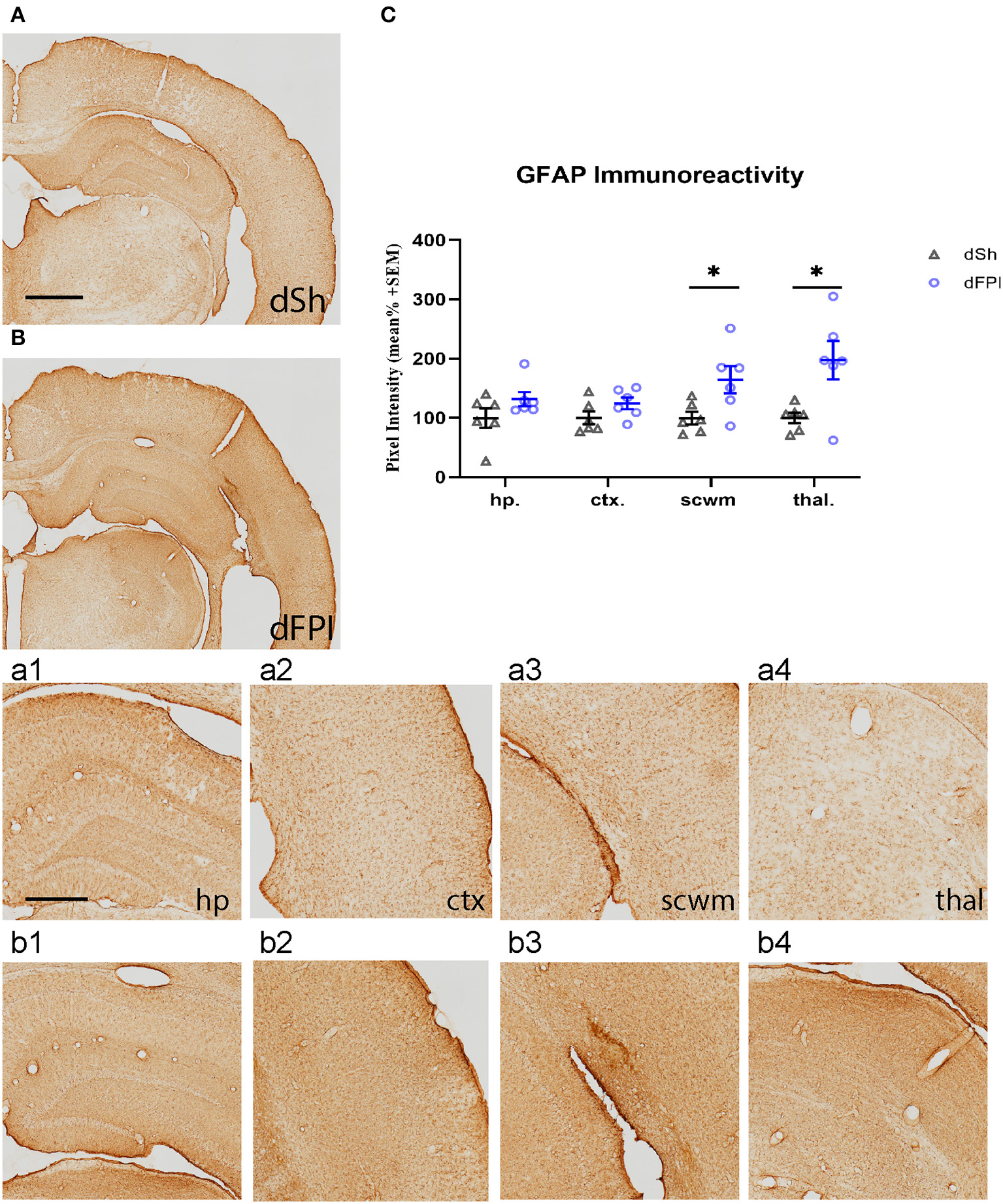 Dual FPI results in increased GFAP abundance in the subcortical white matter and thalamus 2 weeks post-injury. Representative images of GFAP immunoreactivity in the ipsilateral hemisphere at 14 days following dSh (A) and dFPI (B) are shown (total of n = 6 per group), scale bar equal to 1 mm. Representative higher magnification images collected of dSh (A) and dFPI (B) highlight GFAP subregional immunoreactivity in the dSh ipsilateral hippocampus (a1), cortex (a2), subcortical white matter (a3), thalamus (a4) and similarly, dFPI subregions (b1–b4), scale bars equal to 500 μm (a1–a4,b1–b4). (C) Mean pixel intensity measures of GFAP immunoreactivity revealed a significant increase in the subcortical white matter and thalamus following dFPI (Student's t-test, *p < 0.05). Regional analyses were normalized to mean pixel intensity.
