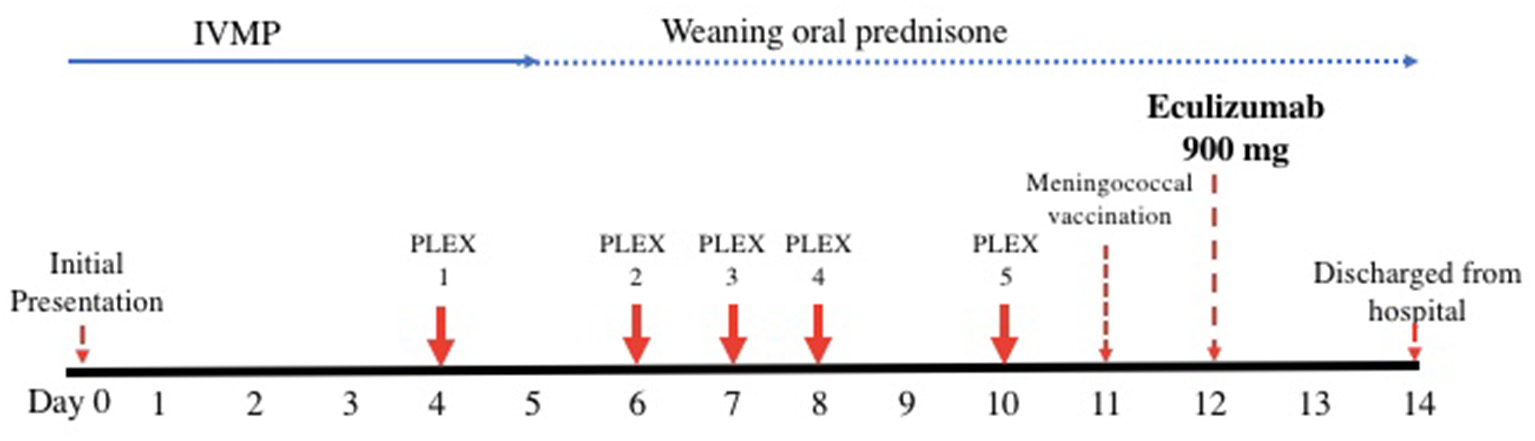 Timeline of acute therapy administered during hospital admission. IVMP, intravenous methylprednisolone; PLEX, plasmapheresis.