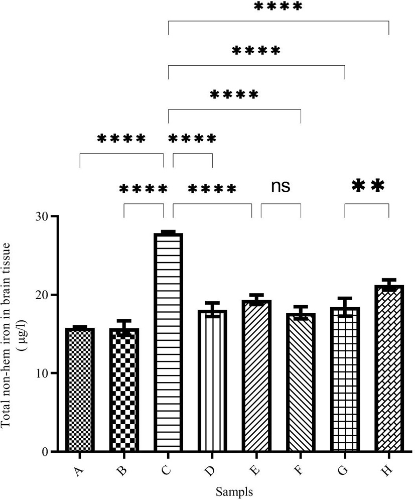 Brain total non-heme iron content in the treated mice. Group A: control group, normal saline-receiving group; Group B: normal saline and DFO-receiving group; Group C: iron dextran and normal saline-receiving group; Group D: iron dextran and DFO-receiving group; Group E: low dose caffeic acid-receiving group (30 mg/kg/day); Group F: high dose caffeic acid-receiving group (50 mg/kg/day); Group G: low dose ferulic acid-receiving group (30 mg/kg/day); and Group H: high dose ferulic acid-receiving group (50 mg/kg/day) (Mean ± SD; **p ≤ 0.01 and ****p ≤ 0.0001).