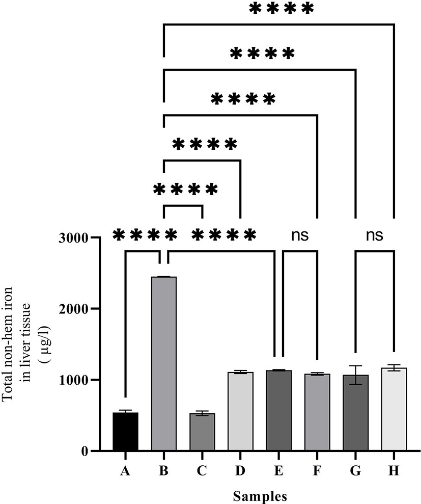 Liver non-hem iron content in the treated mice. Group A: control group, normal saline-receiving group; Group B: normal saline and DFO-receiving group; Group C: iron dextran and normal saline-receiving group; Group D: iron dextran and DFO-receiving group; Group E: low dose caffeic acid-receiving group (30 mg/kg/day); Group F: high dose caffeic acid-receiving group (50 mg/kg/day); Group G: low dose ferulic acid-receiving group (30 mg/kg/day); and Group H: high dose ferulic acid-receiving group (50 mg/kg/day) (Mean ± SD; ns, non-significant and ****p ≤ 0.0001).