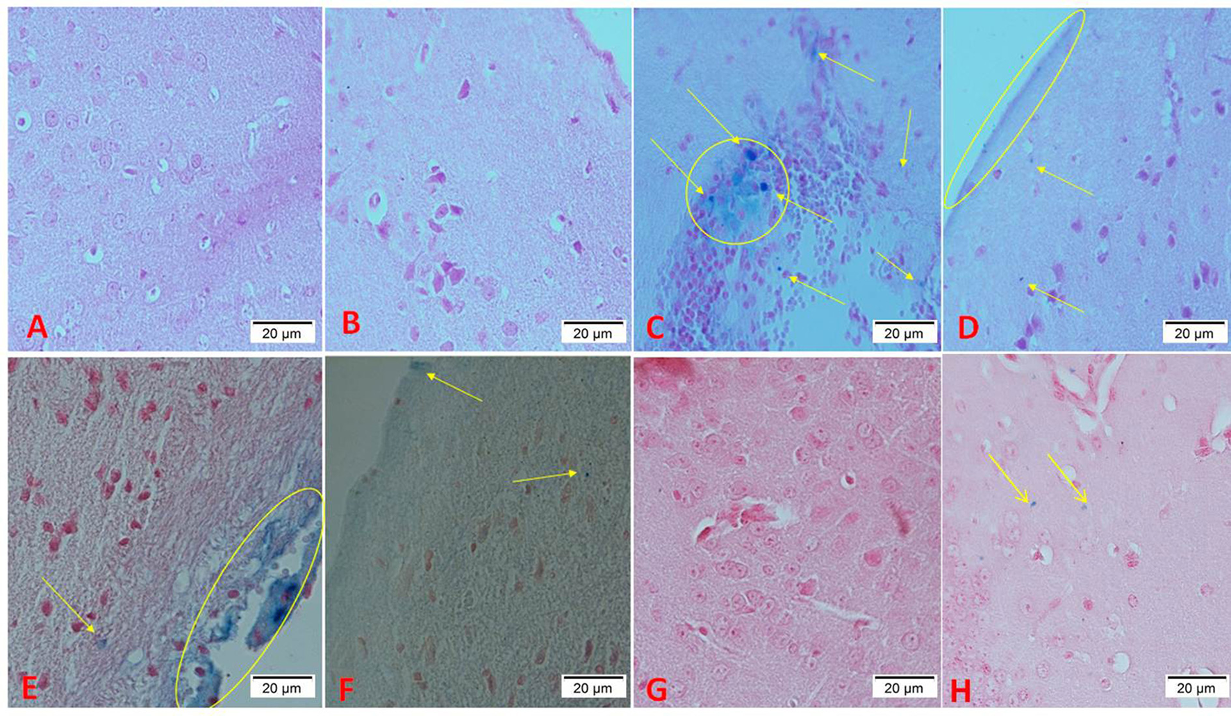 Figure 4 shows the results of Perls iron staining of tissue samples. Blue spots indicate iron deposition. Figures 4A,B shows the brain of groups A and B, respectively. As it is observed, there is no iron deposition in these groups. Figure 4C displays the iron-overloaded group. In this group, a large iron deposition is observed. DFO administration has significantly reduced iron deposition in the brain tissue (Figure 4D). Caffeic acid treatment significantly reduced iron deposition (Figures 4E,F). In the group treated with a lower dose of ferulic acid, the iron deposition rate was lower than its high dose (Figures 4G,H).