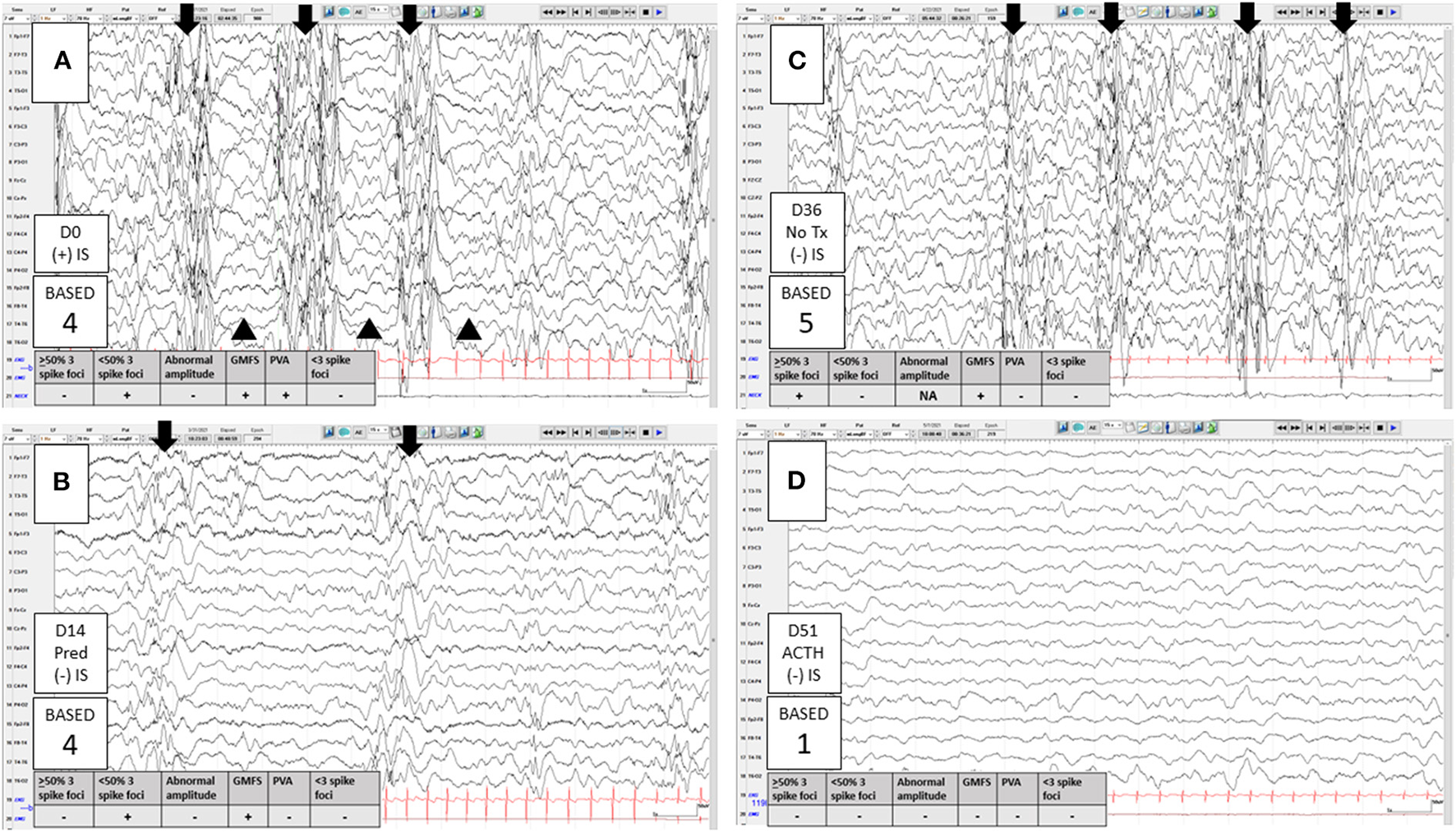 Clinical application of the 2021 Burden of AmplitudeS and Epileptiform Discharges (BASED) score. A 4-month-old infant born at 39 weeks gestational age, with known developmental delay due to hypoxic ischemic encephalopathy, presented with new onset infantile spasms (IS). Onset of IS to treatment initiation was 1 day. (A) Day 0 (diagnosis and treatment), just <50% of 1 s (s) bins within a 5-min (m) epoch of sleep included at least one spike and there were grouped multifocal spikes (GMFS, arrows) as well as paroxysmal voltage attenuations (PVA, arrowheads). The presence of either GMFS or PVA indicated a BASED score of 4 (EEG findings to suggest a probable epileptic encephalopathy [EE]). (B) Day 14, IS and PVA resolved with high-dose prednisolone, with a subjective reduction in the burden of spikes. However, because of persistent GMFS (now less well-formed), the BASED score remained 4. At this point, there was no electrographic remission (pretreatment scores of 4 or 5 must improve to a 3 or less for remission). With the resolution of IS and subjective improvement on the EEG, the treating clinician did not pursue additional treatment at that time (despite the lack of electrographic remission by BASED score criteria). (C) Day 36, still no IS but the EEG showed a higher burden of spikes, now with >50% of 1-s bins having at least one spike in a 5-m epoch of sleep, indicating a BASED score of 5 (EEG findings to suggest a definite EE). Better formed GMFS (arrows) were present. Notice that the background wave amplitude assessment is not reliable when the burden of spikes is ≥50%. High-dose adrenocorticotropic hormone (ACTH) was started at that time. (D) Day 51, all spikes resolved with ACTH. The background was slow and disorganized indicating a BASED score of 1 (Any definite non-epileptiform abnormality). This score, with the persistent remission of IS, indicated electro clinical remission. Longitudinal bipolar montage, Sensitivity 10 mv/mm, LFF 1 Hz, HFF 70 Hz, 15 s per page. D, days; NA, not applicable; Pred, high-dose prednisolone.
