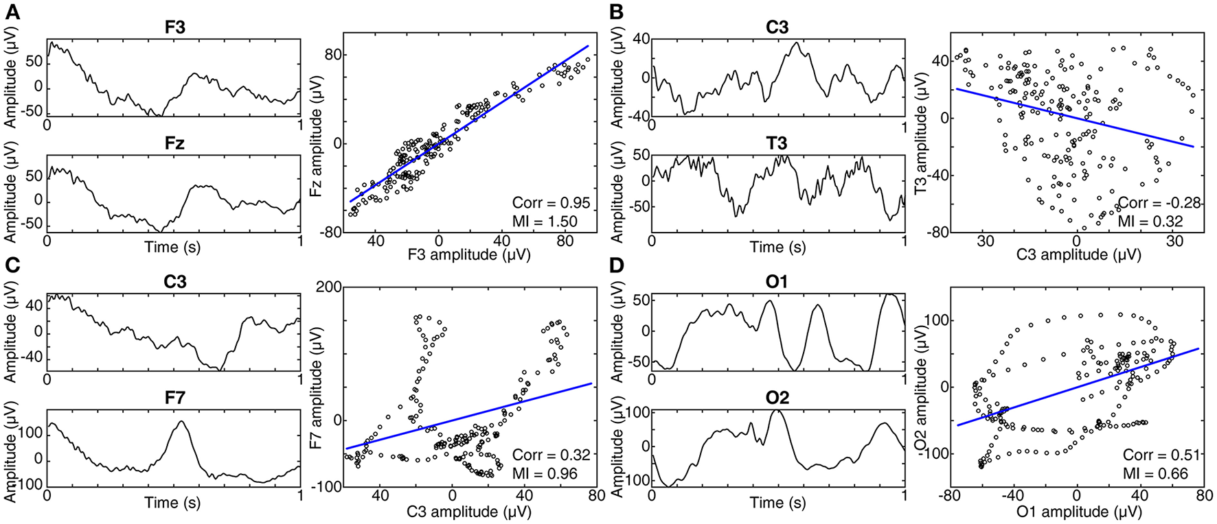 Linear vs. non-linear connectivity measures. (A) EEG signals recorded concurrently from two electrodes, F3 and Fz, are shown on the left. In the panel on the right, each data point represents one time point from the EEG signals, with the value of F3 on the horizontal axis, and the value of Fz on the vertical axis. In this case, the signals exhibit a linear relationship and thus have high values of both correlation and mutual information (MI). Recall that correlation is sensitive only to linear relationships, while MI is sensitive to both linear and non-linear interactions. (B) When the two EEG signals are unrelated, no trend can be seen in the right panel, and the values of correlation and MI are low. (C) When the relationship between the signals is non-linear, the MI is high, while the correlation is low. (D) A second example of a non-linear relationship, with medium correlation and MI.