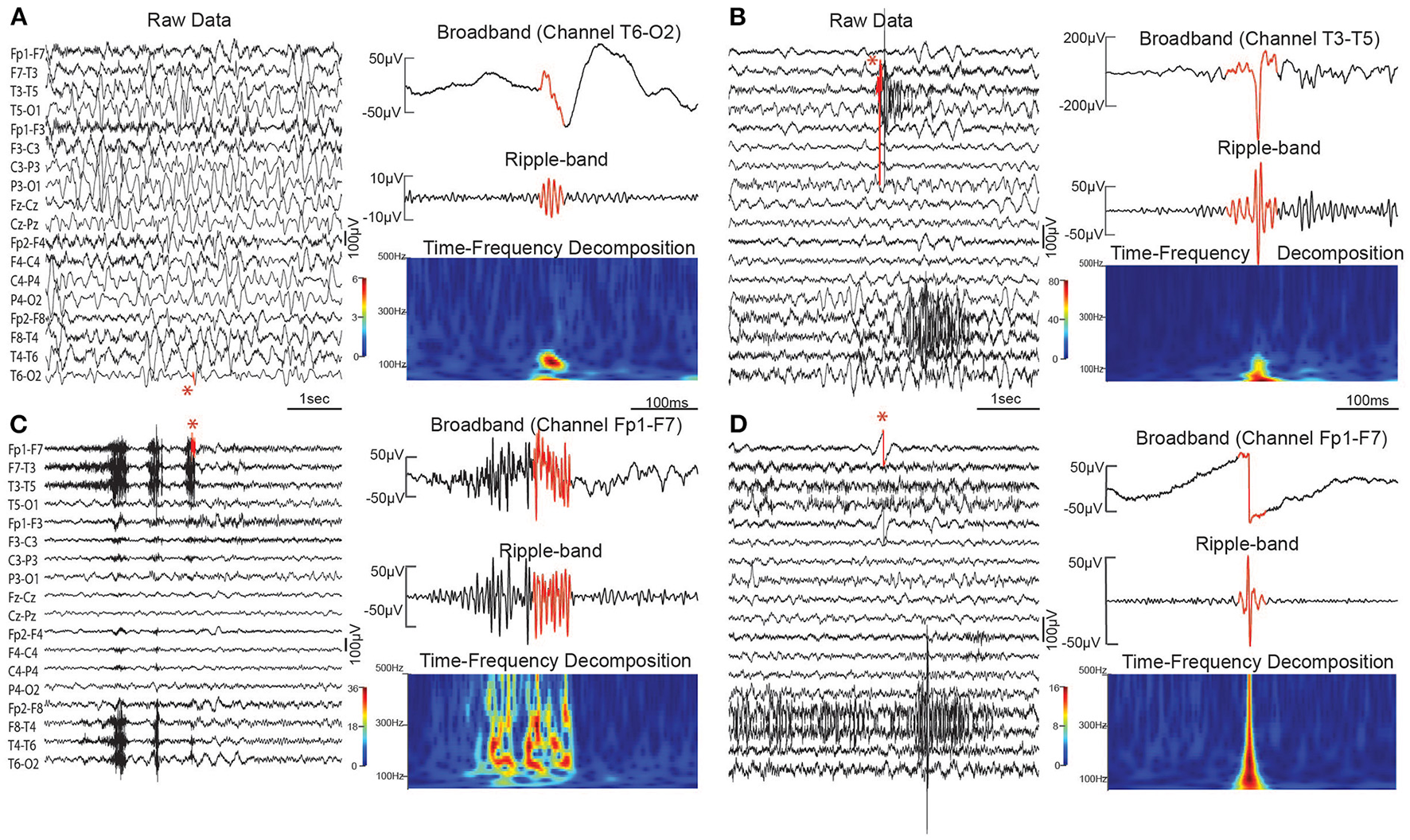 Scalp HFO and artifact examples. (A) Scalp HFO in bipolar channel T6–O2 in a child with IS. (B) Sharp artifact in channel T3–T5. (C) Muscle artifact in Channel Fp1–F7. (D) DC shift artifact in Channel Fp1–F7. Sharp artifacts, muscle activity, and DC shifts can all cause false positive HFO detections. In each subfigure, 5 s of broadband EEG is shown (left), with the red portion of the signal indicating the detected event (also marked by a red asterisk). On the right is the broadband EEG, with the detected event in red (top), the bandpass filtered EEG in the ripple frequency band (middle), and the time-frequency decomposition for the same segment of EEG (bottom).