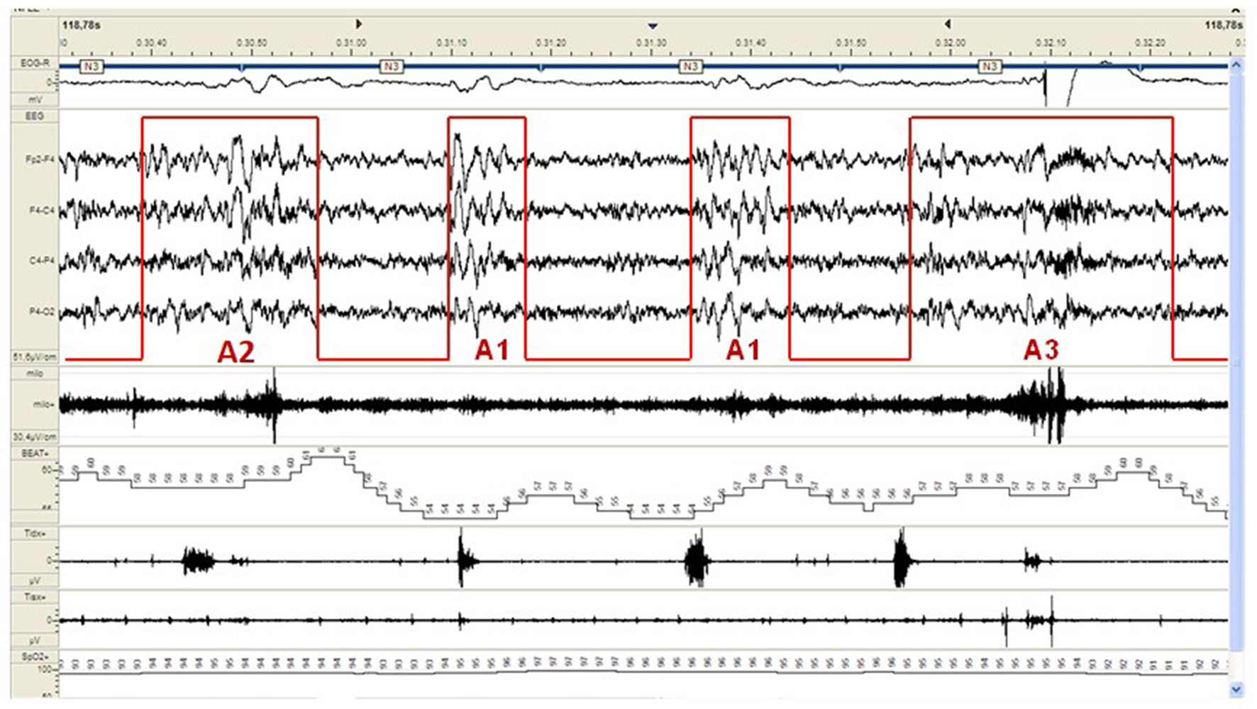 Example of a CAP sequence (CAP phases A highlighted in red) during stage N3 of NREM sleep in a patient affected by periodic limb movement disorder (PLMD). Note that the more disturbing leg movements (right part of the figure) are associated with CAP subtype A3. CAP subtypes A1 have a milder cardiovascular impact.