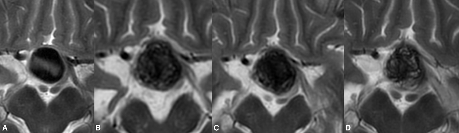 Post-treatment enlargement of a giant paraophthalmic ICA aneurysm (A). During routine clinical examinations, the patient showed temporary aggravation of the presenting visual symptoms due to increase chiasmal compression. The first radiological follow-up demonstrated the treatment-related volume increase of the treated aneurysm (B). Following prolonged steroid and NSID therapy, the patient's visual status improved notably. Twelve months after the treatment, the observed growth of the aneurysm was seized with documented aneurysmal shrinkage (C). Lack of signal void within the aneurysm on T2WI in the same patient at 24 months indicates the ongoing aneurysm thrombosis (D). The last follow-up also noted the collapse of the previous growing aneurysm.