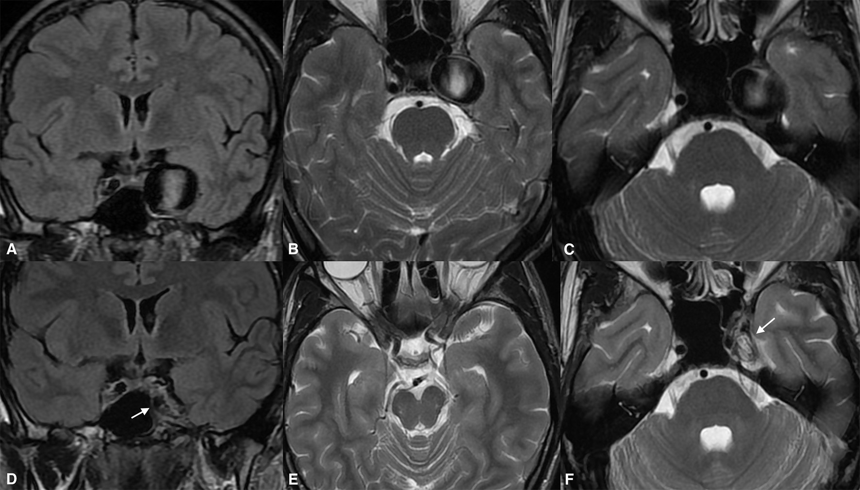 Giant partially thrombosed cerebral aneurysm causing quadriparesis and obstructive hydrocephalus due to brain stem compression (A,D). Significant post-treatment clinical improvement was confirmed due to alleviation of the brain stem compression (B,C). The ongoing collapse of the aneurysmal sac with progressive intrasaccular T2WI signal changes was noted during the long-term follow-up (E,F).