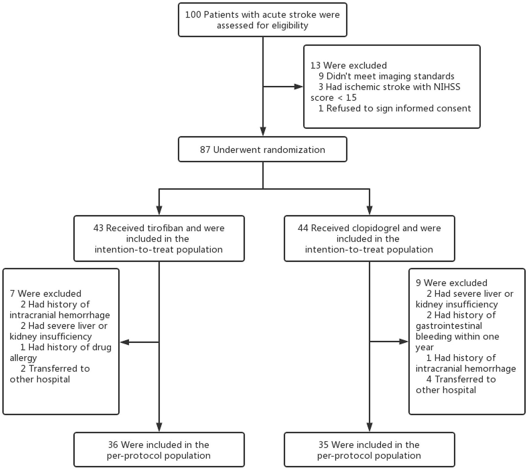 Patients in the tirofiban group received 3–4 μg/(kg·h) tirofiban through intravenous injection; those in the control group were given 75 mg/d clopidogrel through nasal feeding. The patients in both groups continued receiving assigned medications until discharge. In addition, the patients in both groups received the same basic treatment [atorvastatin for plaque stabilization and lipid regulation, mannitol dehydration for intracranial pressure reduction, and edaravone for brain tissue protection]. After discharge, the patients continued to take oral antiplatelet medication, rehabilitation, and nursing treatment according to local standards. The follow-up and data collection were continued for 3 months.