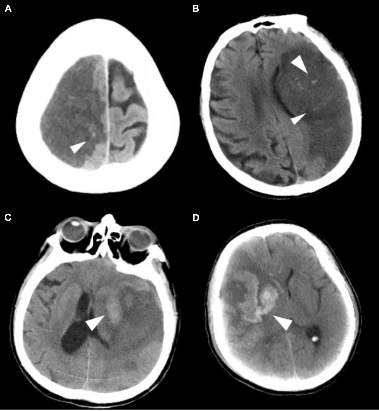 Imaging classification of the hemorrhagic transformation. (A) HI 1: Small petechiae along the margins of the infarct. (B) HI 2: More confluent petechiae within the infarcted area, but without space-occupying effect. (C) PH 1: Blood clot not exceeding 30% of the infarcted area with some mild space-occupying effect. (D) PH 2: Dense blood clot(s) exceeding 30% of the infarct volume with significant space-occupying effect.