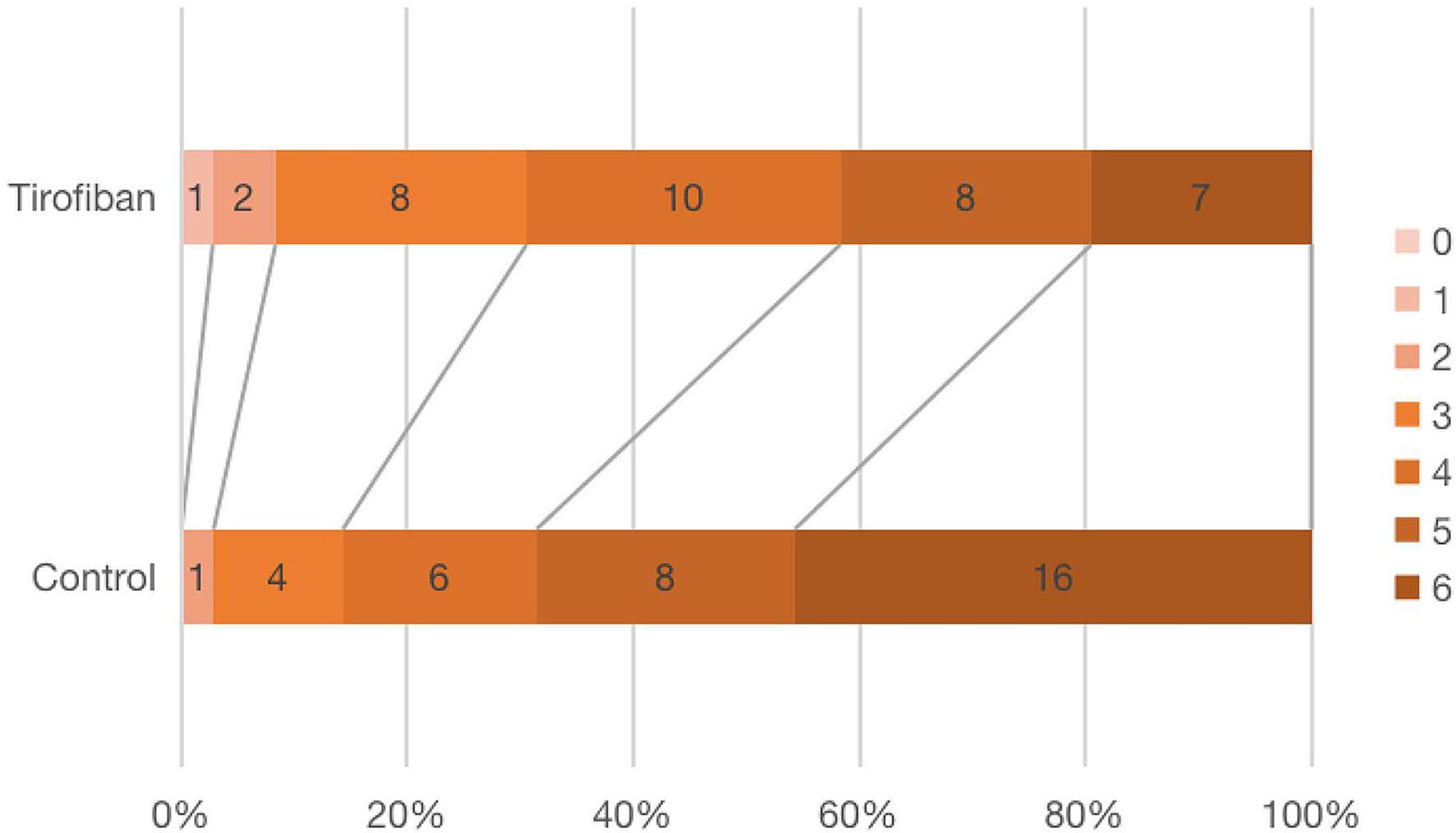 Overall, from June 2021 to December 2021, we enrolled a total of 36 patients who received low-dose and long-course [median (quartile range), 8.5 (5–10); mean ± SD, 8.33 ± 4.58 days) treatment with tirofiban and 35 patients who received clopidogrel. After enrollment, the baseline information and experimental data of the patients were recorded, and all of the patients were followed up for 90 days. The ages of tirofiban group and control group were 72.57 ± 12.39 and 73.89 ± 9.82, respectively (p = 0.665). There were 29 men (80.6%) in tirofiban group and 18 men (51.4%) in control group (p = 0.009). The baseline data of the diseases and habits and the clinical data at admission were comparable between the two groups, except for the history of coronary heart disease (p = 0.013) and the history of smoking (p = 0.003). The etiological classifications of TOAST in the two groups were comparable too, there were 30 (83.3%) patients with LAA and 6 (16.7%) patients with CE in the tirofiban group compared with 29 (82.9%) patients with LAA and 6 (17.1%) patients with CE patients in the control group (LAA, p = 0.957; CE, p = 1.000). At the same time, all the patients in the two groups belonged to the complete anterior circulation occlusion according to the OCSP classification (Table 1).