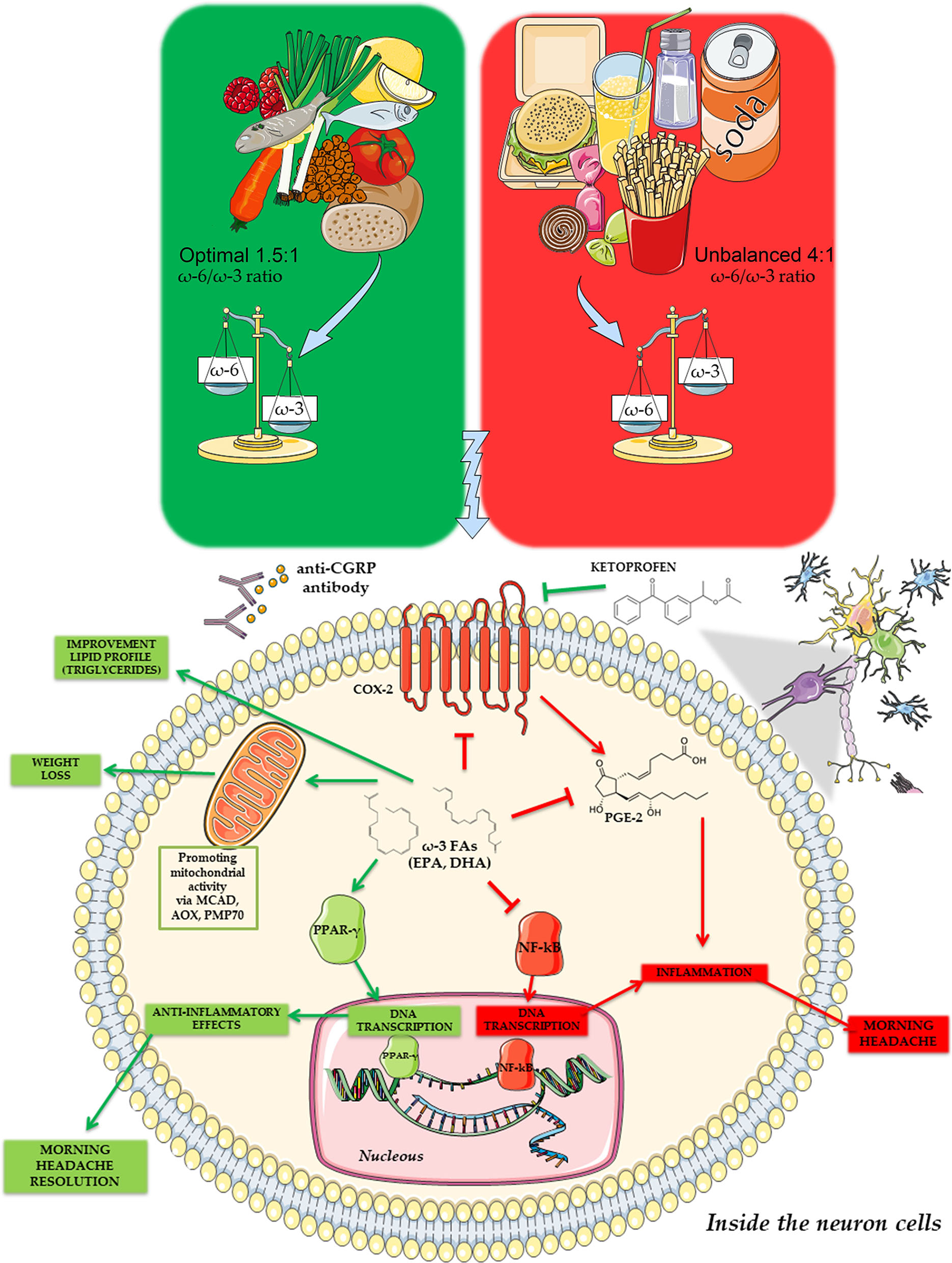 One of the best dietary patterns to prevent and inhibit neuroinflammation is the Mediterranean Diet (MD) (12). The MD is based on consuming several typical foods, such as whole grains, legumes, extra virgin olive oil, fish, vegetables, fruits, and nuts, which contain nutrients essential to maintaining human health. MD is rich in antioxidants, fiber, and Monounsaturated Fats (MUFAs) and an adequate balance of omega-6 (ω-6)/omega-3 (ω-3) fatty acids (FAs). It is poor in Saturated Fats (SFAs) and animal proteins (13). MD represents excellent support to therapies for chronic degenerative diseases (CDDs) (14). Moreover, Parletta et al. have recently demonstrated the correlation between MD, particularly rich in ω-3 derived from fish and olive oil, and mental health in people with depression (15). ω-3 and ω-6 FAs act as precursors of some bioactive lipid mediators, including prostaglandins, leukotrienes, resolvins, and maresins (known as oxylipins), able to regulate inflammation involved in CDDs, mental health disorder, and pain. However, ω-3 fatty acid derivatives are associated with antinociceptive and anti-inflammatory effects, while ω-6 fatty acid-derived oxylipins worsen to pain and cause migraines in several experimental models (16). Previous studies evaluating ω-3 fatty acid supplementation for migraines have been inconclusive (17). However, it has been hypothesized that diets rich in ω-3 fatty acids would increase serum 17-hydroxydocosahexaenoic acid (17-HDHA), a derivative with antinociceptive effects reducing headache-related disability (18). The dietary imbalance of high ω-6 fatty acids and low ω-3 fatty acids intake, characteristic of certain dietary patterns, such as the Western diet, may promote physical pain, and has been associated with the onset of inflammatory diseases (19). In countries adhering to a Western diet, the ω-6/ω-3 ratio is 15–17:1 (19), while it is about 10:1 (20) in Italy, a Country based on Mediterranean foods. Therefore, identifying the right ω-6/ω-3 ratio is of primary importance, rather than modulating the intake of only one of the two classes of fatty acids.