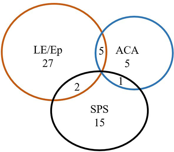 | Clinical syndrome | LE/Ep (N = 34) | SPS (N = 18) | ACA (N = 11) |