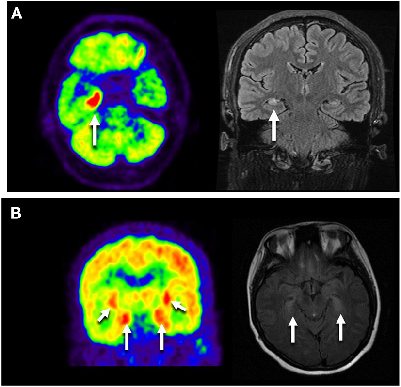 Neuroimages of the GAD65 antibody associated neurological disorders. (A) Images of NO.9 who presented with Ep. Axial FLAIR MRI showed right temporal hyperintensity, and Axial FDG-PET/CT scan showed hypermetabolic right mesiotemporal spot (white arrow). (B) Images of NO.41 who manifested as LE plus ACA. 18F-FDG PET/CT showed increased FDG uptake in the bilateral medial temporal lobes. MRI showed bilateral medial temporal lobe T2 hypertension. LE, limbic encephalitis; Ep, epilepsy; ACA, autoimmune cerebellar ataxia.