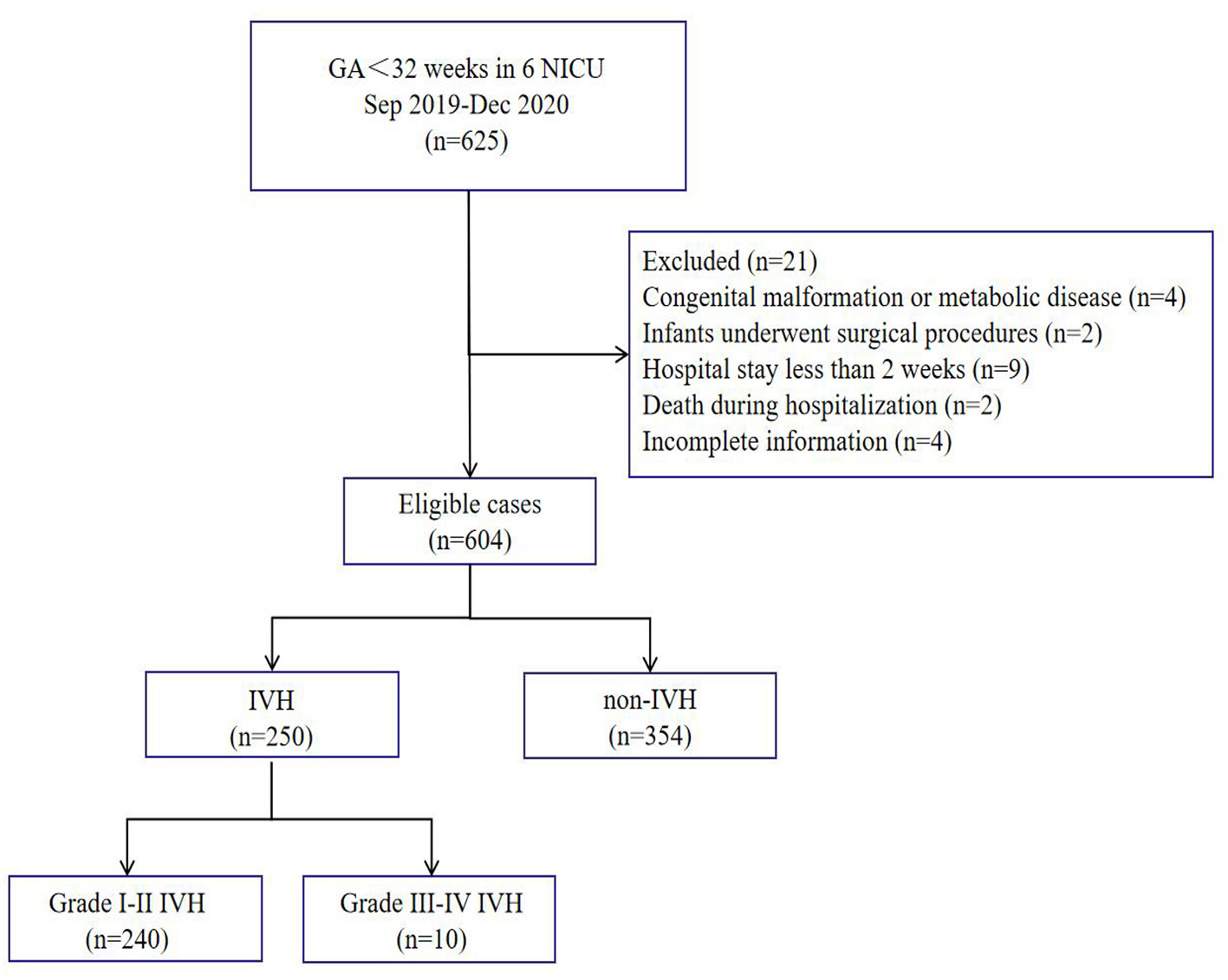 This study is a retrospective secondary analysis of a multi-center prospective observational study, including 604 VPIs from a neonatology department of six tertiary hospitals in East China from September 2019 to December 2020, namely four children's hospitals, one tertiary general hospital, and one maternal and child health care hospital. For the analysis of influencing factors, the infants were divided into two groups based on whether IVH occurred.