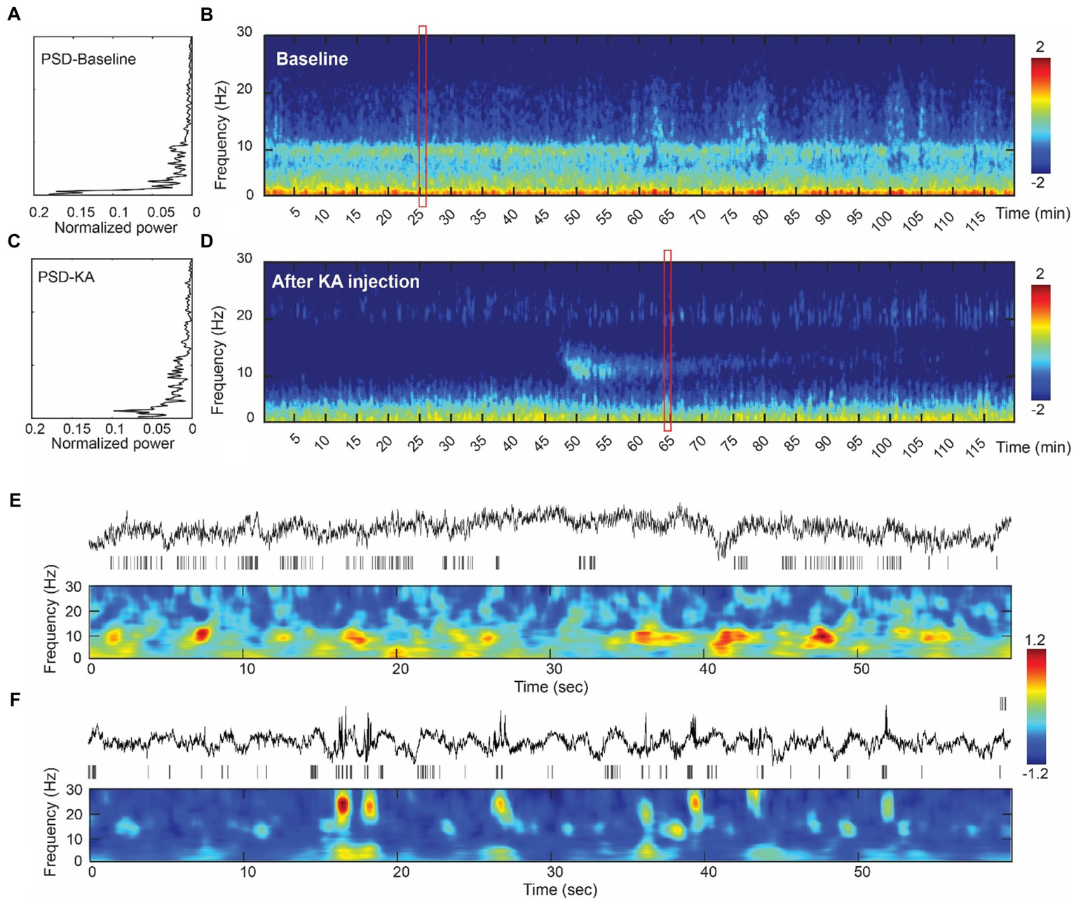 Assessment of the intracranial recordings before and after KA injection. (A) The analysis of power spectrum from the baseline recording. (B) An illustration of multi-tapper analysis from the 2-h epoch of baseline data. A clear eye-closed alpha band occurs in both PSD and multi-tapper plots. (C) Power spectrum plot from the animal after the KA-lesion (from week1). (D) The multi-tapper analysis from the 2-h epoch of the data after KA-lesion (from week1). (E) (Top-bottom) Demonstration of the 60 s local field potentials (LFPs) and the time-frequency decomposition (0–30 Hz). Data were obtained in the redbox shown in (B). (F) Similar plots as Figure E, but obtained from the data after KA injection (redbox in D). Compared to the baseline, data from the post-KA period showed a suppression of the lower frequency band (delta wave, 0–3 Hz) and a decrease of the alpha band (10 Hz), but an increase of the spindle-like activity (see the bursts > 20 Hz).