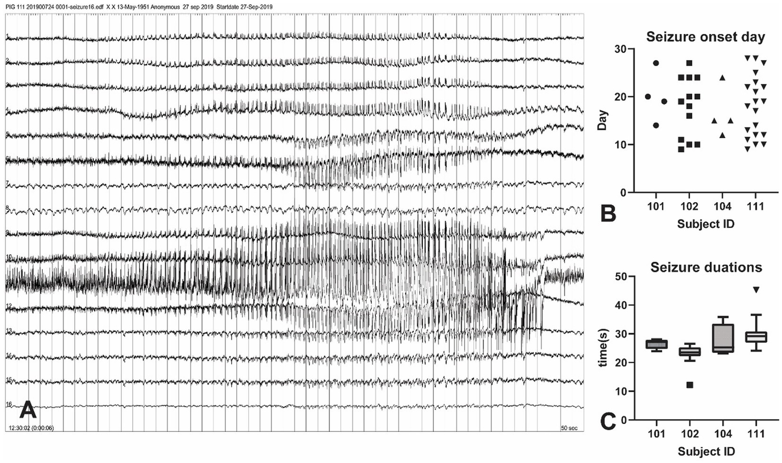 Seizure events in the KA-pig model of epilepsy. (A) Screenshot of a tonic–chonic electrophysiological seizures onset in an animal after KA injection. The onset is located in channel 11, later confirmed to be the right hippocampus. A total of 46 electrophysiological seizures were captured in the 4-week post-KA period from 4 animals (25% of the total). (B) The analysis of the seizure onset day. The earliest chronic seizure onset was observed in animal 111, on day 9 (shown in Figure A), and the last one was on day 27. The first seizure onset day is from 9–14 in these animals. (C) Seizure durations from all recorded 46 seizures in 4 pigs. The seizure duration ranged from 22 s to 35 s.