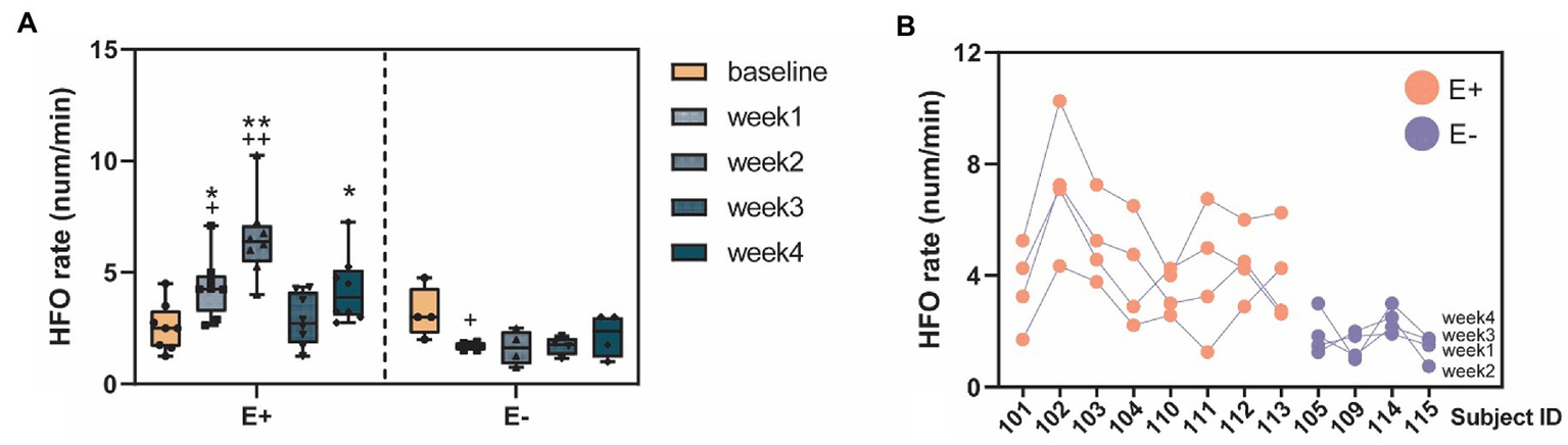 We studied the within-and between-group differences of HFO rates corresponding to different experimental periods (baseline vs. post-KA). In the within-group comparison, there were significant increases of HFO rates in the E + group (F = 10, p < 0.001) in the post-KA period compared to the baseline, specifically observed in week1 (p = 0.47) and week2 (p < 0.001). However, there were no significant differences in HFO rates in the E-group (F = 2.8, p = 0.065), though there was a slight decrease in the HFO rate in week 1 (p = 0.43). For the between-group comparison, we found E+ > E– in week1 (p = 0.005), week2 (p < 0.001), and week4 (p = 0.48). The HFO rates of E + and E – in the baseline were similar (p = 0.93; Figure 5A).