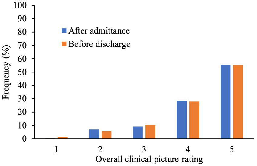 Figure 2 demonstrates the frequency distribution of neurologists’ ratings after admittance and before discharge. These ratings were found to be positively correlated, r = 0.78, p < 0.001.