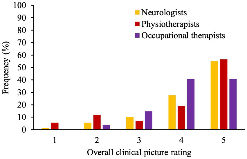 Figure 4 shows the frequency distribution of overall clinical picture ratings conducted by neurologists, physio- and occupational-therapists before discharge. Neurologists and physiotherapists showed a higher correlation in their ratings (r = 0.67, p < 0.001) whereas occupational therapists’ ratings correlated poorly with neurologists’ (r = −0.02, p = 0.91) and physiotherapists’ ratings (r = 0.31, p = 0.13).