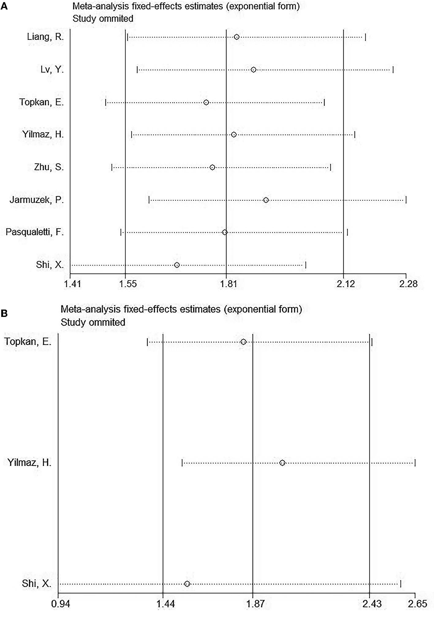 In order to identify the source of heterogeneity and to document the stability of our results, we performed a sensitivity analysis by omitting one study at a time. As shown in Figure 4, following the elimination of the included studies, the pooled HRs did not significantly change, indicating that the results of our study were stable.