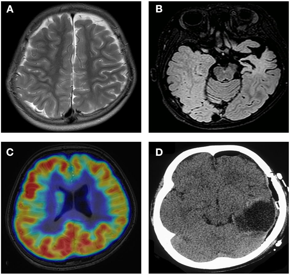 Neuroimaging data of case 4. MRI shows mild atrophy in the left hemisphere (A). MRI reveals encephalomalacia in the left temporal lobe (B). PET shows hypometabolism in the frontal and parietal lobes (C). Imaging shows completed left temporal lobectomy (D).