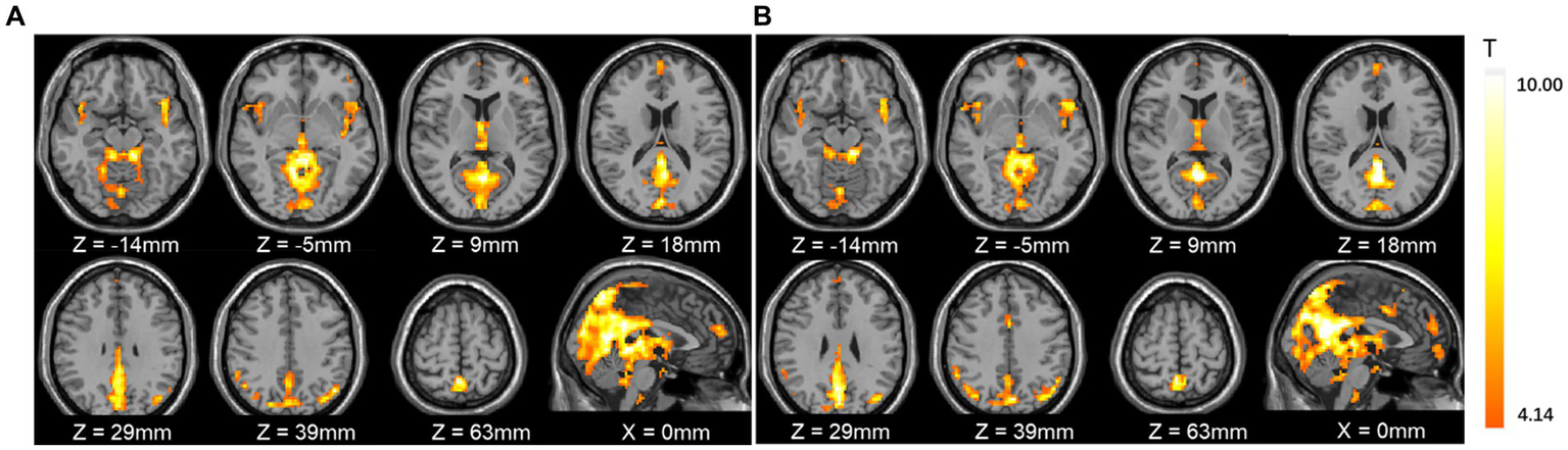 The one sample t-test of mean amplitude of low frequency fluctuation (mALFF) activities with and without masks. (A) Without masks; (B) with masks. The results showed that the mALFF activity patterns were very similar for the two conditions.