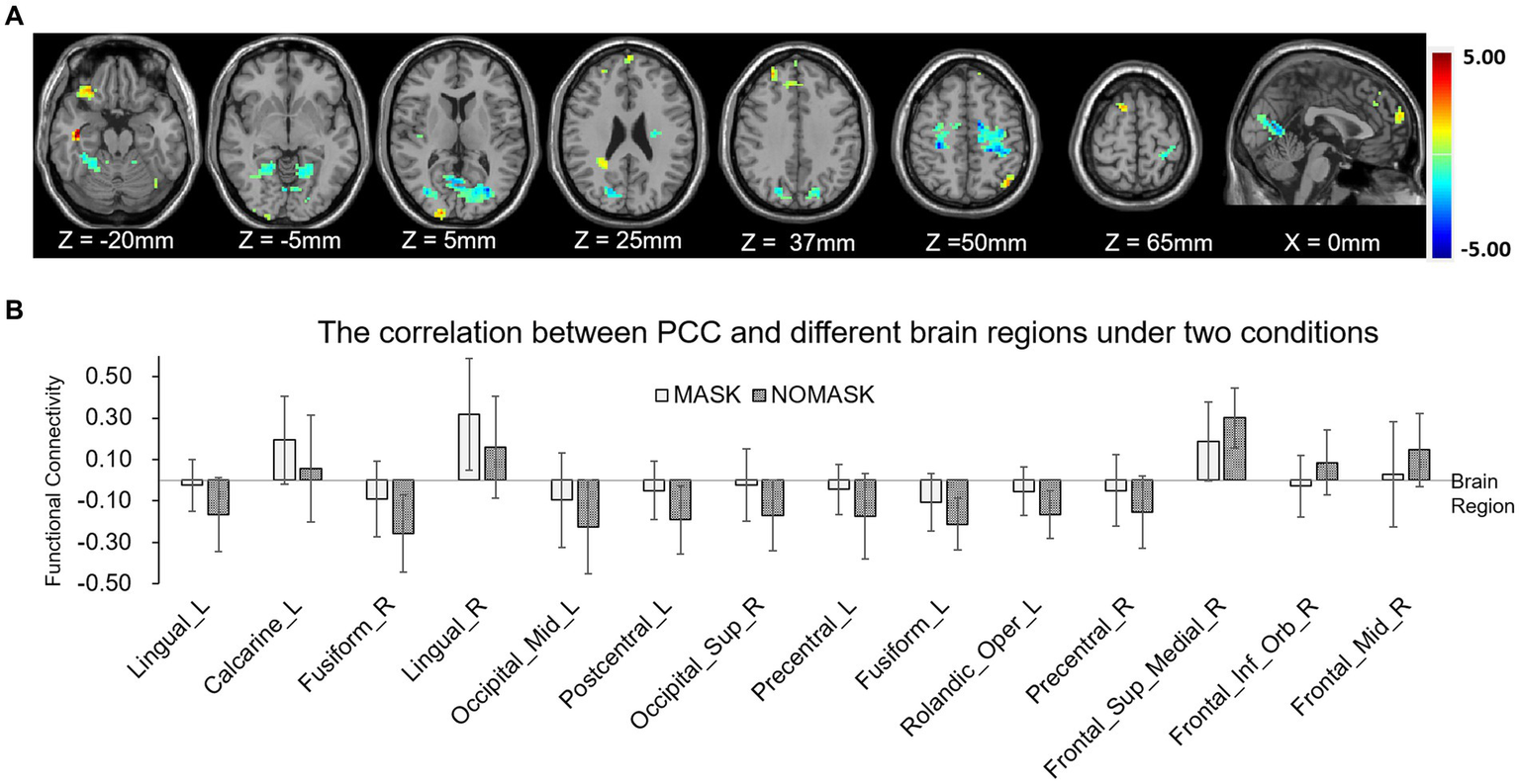 Functional connectivity comparison based on posterior cingulate cortex (PCC) correlation with whole brain activity with and without masks. (A) Brain regions in which the functional connectivity were significantly different with and without face masks. (B) Comparison of correlation strength in different brain regions with and without masks.
