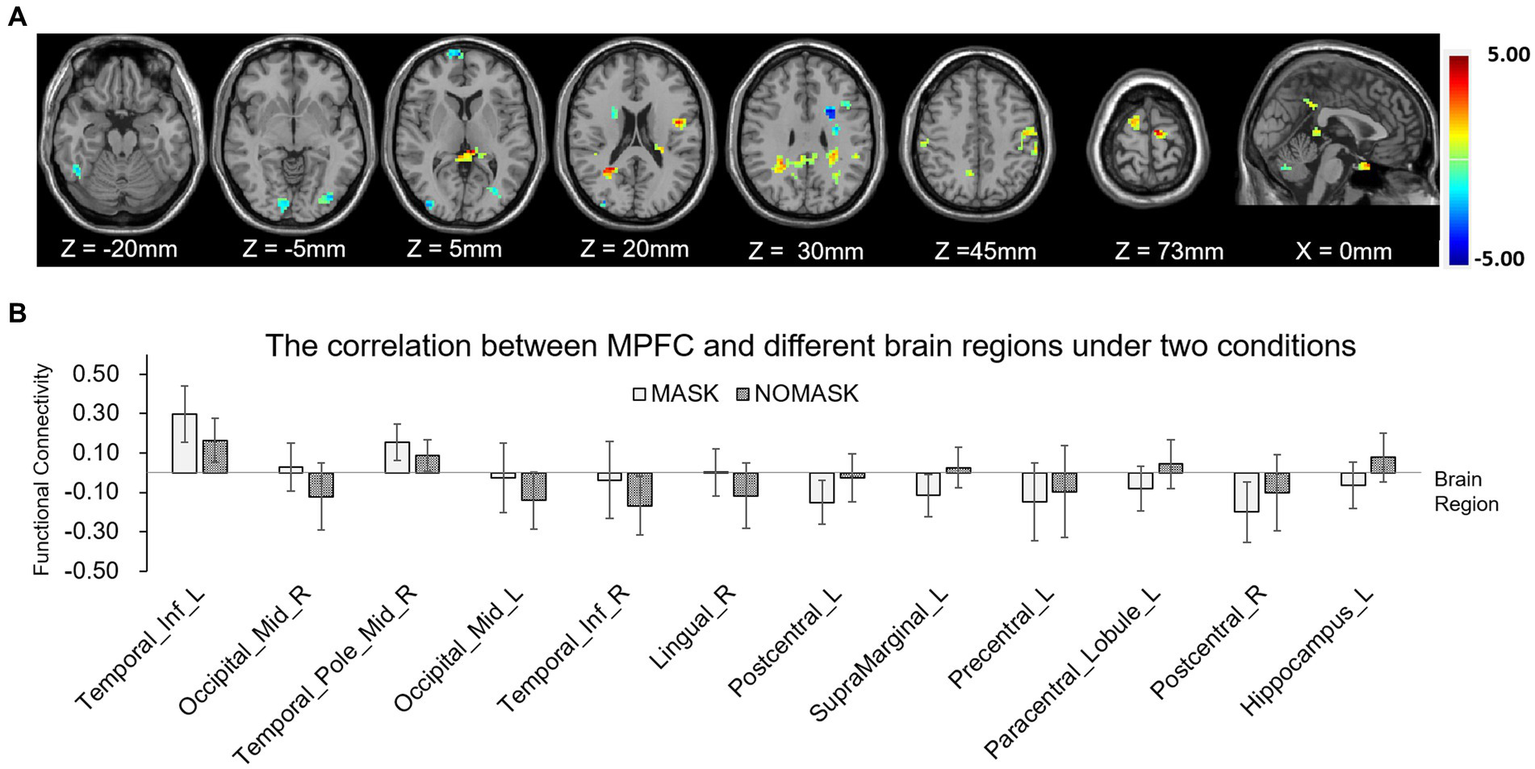 Comparison of mean amplitude of low frequency fluctuation (mALFF) with and without masks by paired t-tests. (A) mALFF activities in brain regions were significantly different with and without face masks. (B) Comparison of power spectrum of mALFF in different brain regions. The posterior cingulate cortex (PCC, MNI coordinates: x = 0 mm, y =−45 mm, z = 27 mm, radius 6 mm) and medial prefrontal cortex (MPFC, MNI coordinates: x = 0 mm, y = 63 mm, z = 13 mm, radius 6 mm) were selected as seed points for functional connectivity analysis. The results of the one-sample t-test with and without face masks showed that the PCC was positively correlated with the precuneus, middle temporal lobe, inferior temporal lobe, medial prefrontal lobe, and orbital inferior frontal gyrus and negatively correlated with the superior marginal gyrus, middle cingulate cortex, rolandic operculum, precentral lobe, postcentral lobe, and fusiform gyrus. The MPFC was positively correlated with the precuneus, posterior cingulate gyrus, supplementary motor cortex, angular gyrus, middle temporal lobe, and inferior temporal lobe and negatively correlated with the superior marginal gyrus, middle cingulate cortex, precentral lobe, postcentral lobe, middle occipital cortex, middle frontal gyrus, and inferior frontal gyrus of the triangle (p < 0.05, Figure 4).