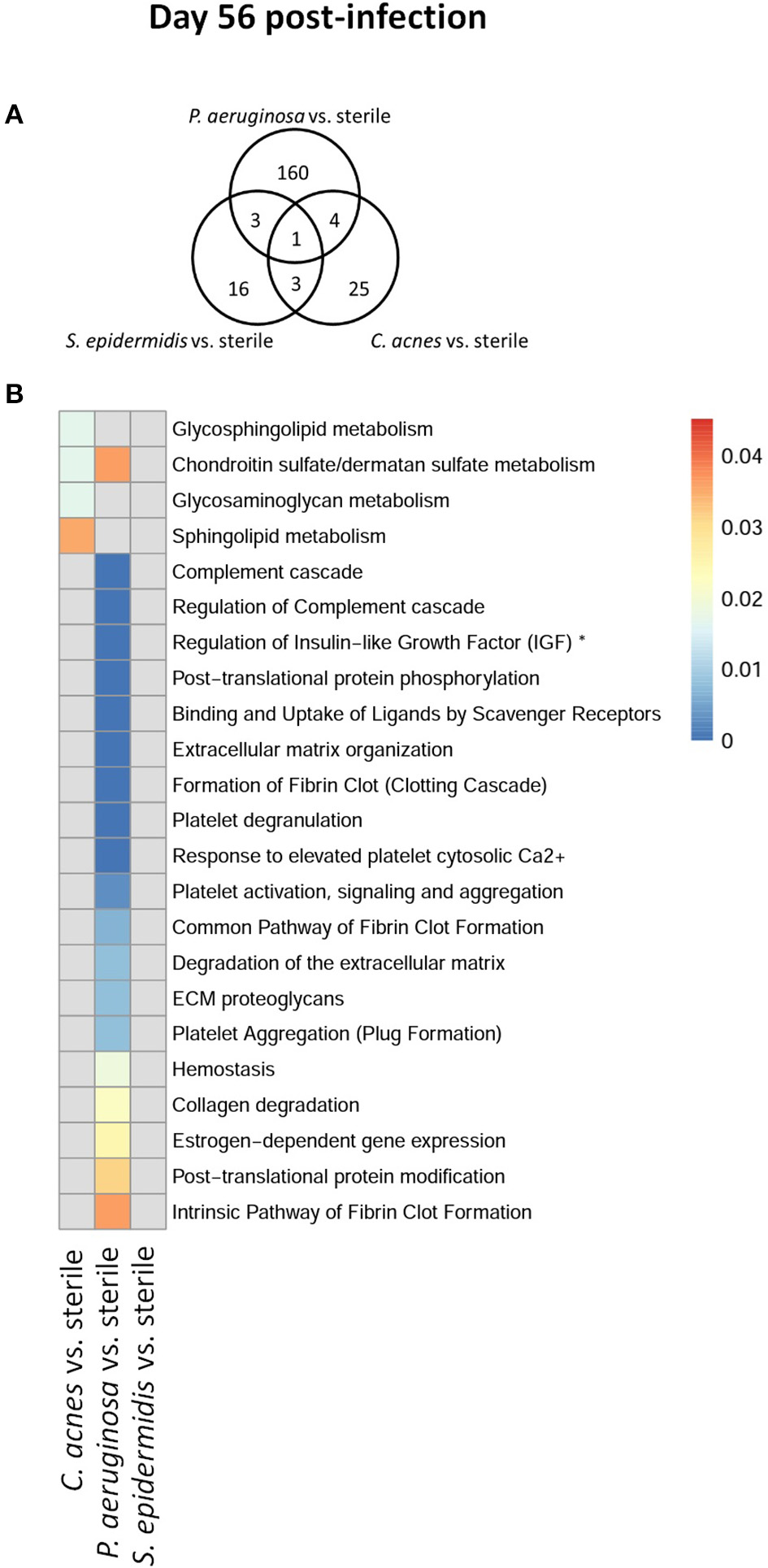 Quantity of differentially expressed proteins in P. aeruginosa, C. acnes, and S. epidermidis infection and overlap between infection types at the late time point, day 56 post-infection (A) as well as functional enrichment (B). *Represents abbreviation of regulation of Insulin-like Growth Factor (IGF) transport and uptake by Insulin-like Growth Factor Binding Proteins (IGFBPS).
