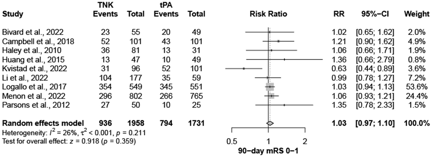 Nine trials, with 3,706 patients, compared outcomes of patients treated with tenecteplase and alteplase for AIS. Both treatments resulted in comparable rates of modified Rankin Scale (mRS) 0–1 at 90 days (RR = 1.03; 95% CI = 0.97–1.10; P-value = 0.359) and mRS 0–2 at 90 days (RR = 1.03; 95% CI = 0.87–1.22; P-value = 0.749). There was no heterogeneity among included studies regarding mRS 0–1 rates (I2 = 26%; P-value = 0.211); however, there was significant heterogeneity in mRS 0–2 rates (I2 = 71%; P-value = 0.002). Similarly, rates of mortality (RR = 0.97; 95% CI = 0.81–1.16; P-value = 0.746) and symptomatic intracranial hemorrhage (sICH) rates (RR = 1.10; 95% CI = 0.75–1.61; P-value = 0.622) were comparable in both treatment groups. There was no significant heterogeneity among included studies in either mortality (I2 = 30%; P-value = 0.181) or sICH (I2 = 0%; P-value = 0.734) rates. Further analysis comparing dosing of tenecteplase (0.1, 0.25, 0.32, and 0.4 mg/kg) yielded no significant differences for any of the endpoints (mRS 0–1, mRS 0–2, sICH, and mortality) compared to alteplase.