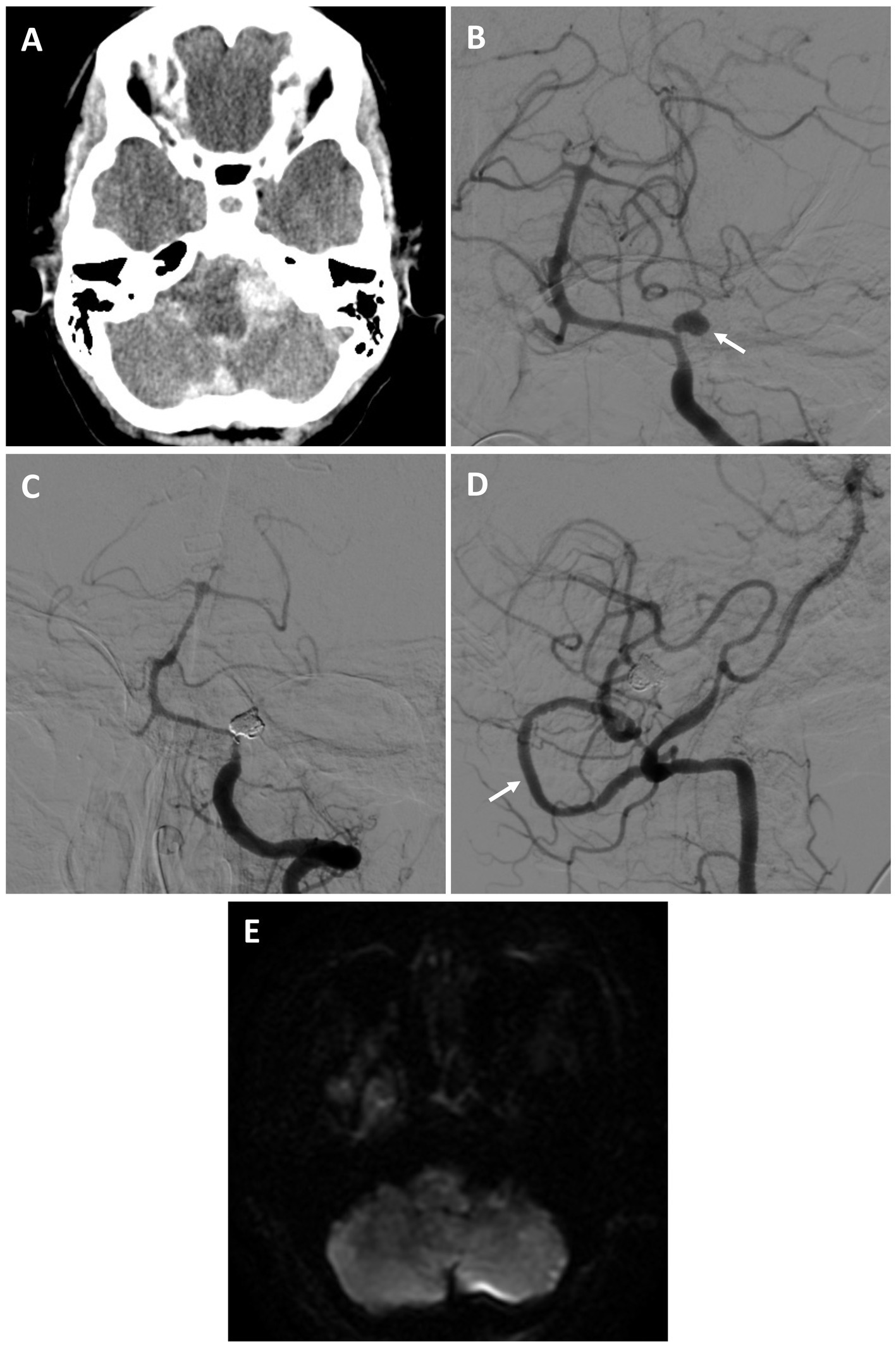 Patient #7. A 59-year-old female experienced a Hunt and Hess 3, Fisher 4 SAH from a left proximal PICA fusiform aneurysm [(A) axial non-contrast head CT; (B) AP angiogram of the left vertebral artery (arrow highlighting aneurysm)]. She underwent a V3 to PICA bypass using a DLCFA interposition graft, followed by internal PICA aneurysm embolization. She had no strokes and an uneventful recovery. On 4-month follow was performing all activities of daily living independently. Angiogram demonstrating PICA occlusion [(C) AP left vertebral artery injection, and patent bypass (D) lateral right vertebral artery injection (arrow highlights bypass)]. (E) Post-procedural MRI (axial DWI) demonstrated no strokes.