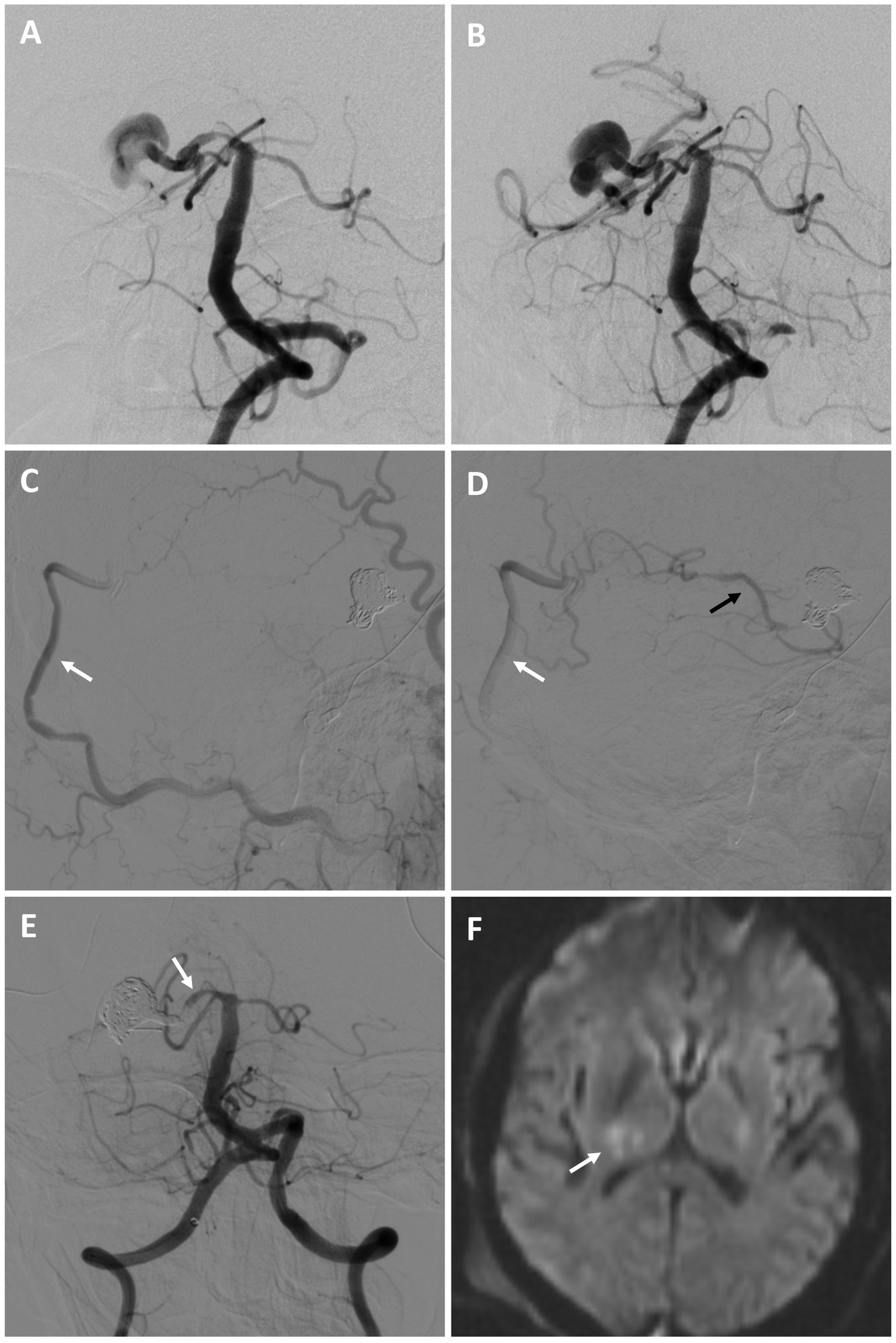 Patient #10. A 53-year-old male was referred for a large right fusiform P2 aneurysm with a proximal dysplastic P1 vessel [(A,B) AP angiogram of the left vertebral artery]. A prior attempt at flow diversion was aborted due to unfavorable anatomy. He underwent a right OA to P4 bypass with a DLCFA interposition graft, followed by a coil embolization/vessel sacrifice of the right P2 aneurysm (keeping the proximal right P1 patent) after BTO [(C,D) serial lateral images from a right external carotid artery injection demonstrating patency of the bypass (white arrows) and backfilling of the PCA territory (black arrow)]. The right P1 was kept open to preserve perforator flow [(E) AP angiogram of the right vertebral artery (arrow highlights right P1)]. Post-operatively he experienced a small right thalamic stroke [(F) axial diffusion-weighted MRI, arrow highlighting stroke], likely from perforators off the severely diseased and sacrificed P2 segment, as well as a small right occipital stroke of unclear etiology (not shown). He had left mild hemiparesis and a partial left hemianopsia. This significantly improved on 9-month follow, where he was living at home and performing all activities of daily living independently.