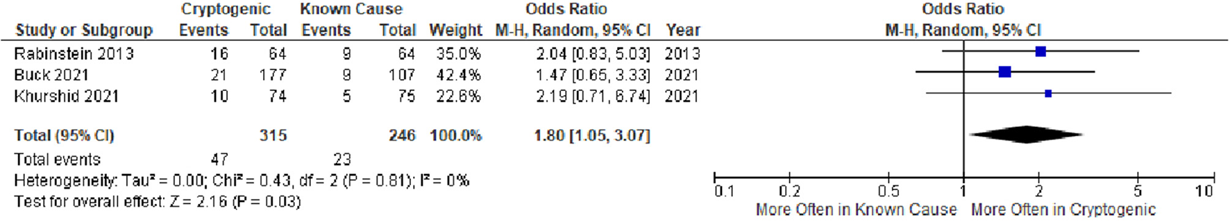 This study has limitations. First, the number of identified case–control and cohort studies and the patients they enrolled was modest, causing wide confidence intervals around all estimates. Accordingly, all study findings should be taken as preliminary. More comparative case–control studies and cohort studies on occult AF in known-cause vs. cryptogenic ischemic stroke are highly desirable. Second, two of the three studies analyzed were cohort studies, with the inherent limitations of selection bias and possible differential intensity in the investigation for occult AF in known-cause vs. cryptogenic stroke. Third, different studies employed different starting times to look for AF, different monitoring durations for the detection of AF, and different modalities (external and internal recording) for the detection of AF. These differences reflect the range of current practice and may reduce the precision of findings. Our use of random-effects, rather than fixed-effects, meta-analysis mitigates but does not completely control this aspect. Fourth, the initiation of long-term monitoring was not started immediately upon discharge in many patients and may have missed early episodes of AF.