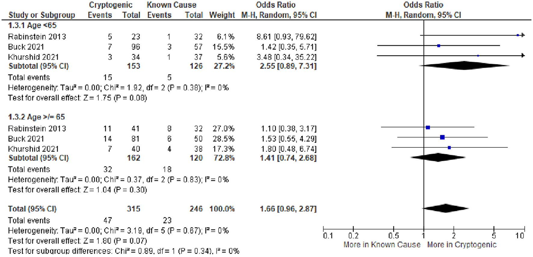Figure 4. Forest plot of studies comparing frequencies of occult atrial fibrillation in patients with cryptogenic ischemic stroke and patients with ischemic stroke of known cause in the subgroups of people under the age of 65 years and who are of age 65 years and higher. CI, confidence interval.