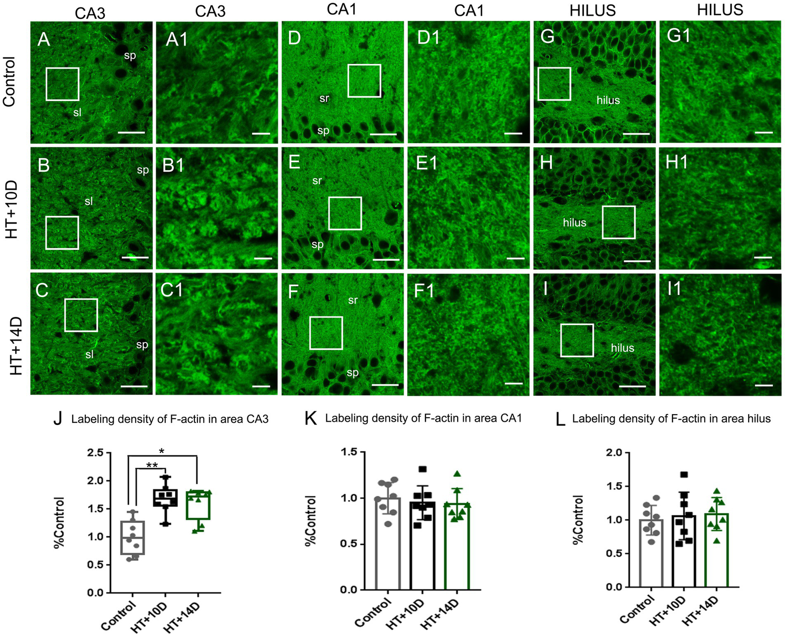 To detect the rearrangement of F-actin cytoskeleton after prolonged febrile seizures, F-actin in subfields of hippocampus was labeled with phalloidin, which binds actin filamentous specifically but not actin monomers (G-actin). Compared with that of control group (Figures 2A, A1), the labeling density of F-actin increased remarkably in the stratum lucidum of subregion CA3 after experimental febrile seizures (Figures 2B, B1 for HT + 10D, Figures 2C, C1 for HT + 14D, Figure 2J for statistical analysis). The relative positive area of F-actin in the stratum lucidum of CA3 region in each group was as follows: Control 0.99 (0.17, 1.26), HT + 10D 1.69 (1.56, 1.84), HT + 14D 1.72 (1.32, 1.80) (**p1 = 0.0056, *p2 = 0.010, n = 8 per group). However, no significant difference is detected between the control group (Figures 2D, D1) and HT+ groups in subregion CA1 (Figures 2E, E1 for HT + 10D, Figures 2F, F1 for HT + 14D, Figure 2K for statistical analysis). The relative positive area of F-actin in the stratum radiatum of CA1 region in each group was as follows: Control 1.00 ± 0.17, HT + 10D 0.95 ± 0.18, HT + 14D 0.94 ± 0.17 (p1 = 0.84, p2 = 0.75, n = 8 per group). Similarly, no significant difference is detected between the control group (Figures 2G, G1) and HT+ groups in hilus of DG (Figures 2H, H1 for HT + 10D, Figures 2I, I1 for HT + 14D, Figure 2L for statistical analysis). The relative positive area of F-actin in the hilus of DG in each group was as follows: Control 1.00 ± 0.22, HT + 10D 1.06 ± 0.35, HT + 14D 1.09 ± 0.24 (p1 = 0.89, p2 = 0.78, n = 8 per group). Further comparisons of F-actin labeling density in subfields CA3, CA1, and hilus of DG between group HT + 10D and HT + 14D were performed and no significant difference was detected (p1 = 0.99, p2 = 0.99, p3 = 0.98. n = 8 per group).