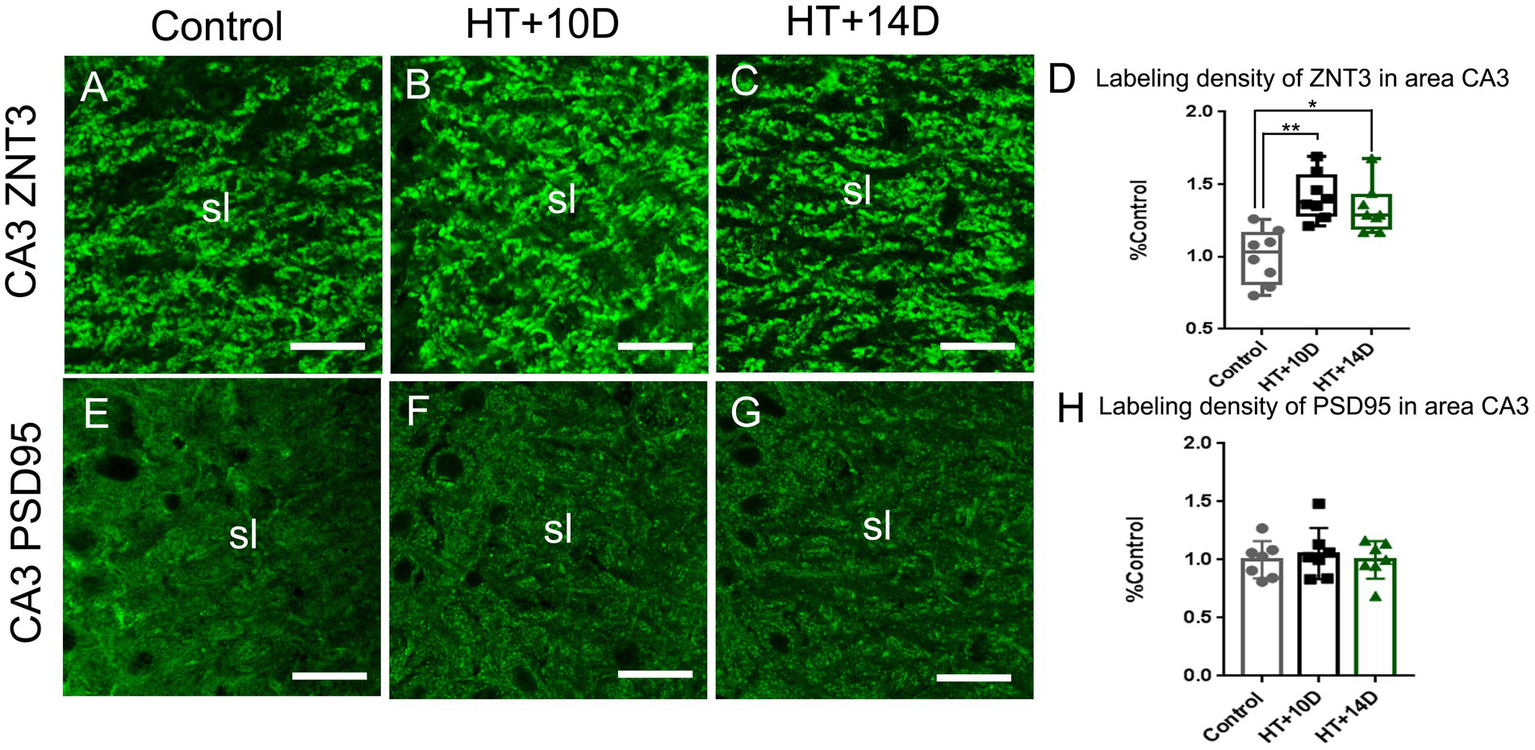F-actin was increased significantly in the stratum lucidum of CA3 region in both HT + 10D and HT + 14D groups and further comparison between the two groups showed no significant difference. The abundance of ZNT3, the presynaptic marker of mossy fiber (MF)-CA3 synapses, increased significantly whereas the postsynaptic marker PSD95 did not change significantly. Overlapping area of F-actin and ZNT3 showed a significant increase in both HT+ groups. The results of cell counts showed no significant increase or decrease in the number of neurons in each area of hippocampus.