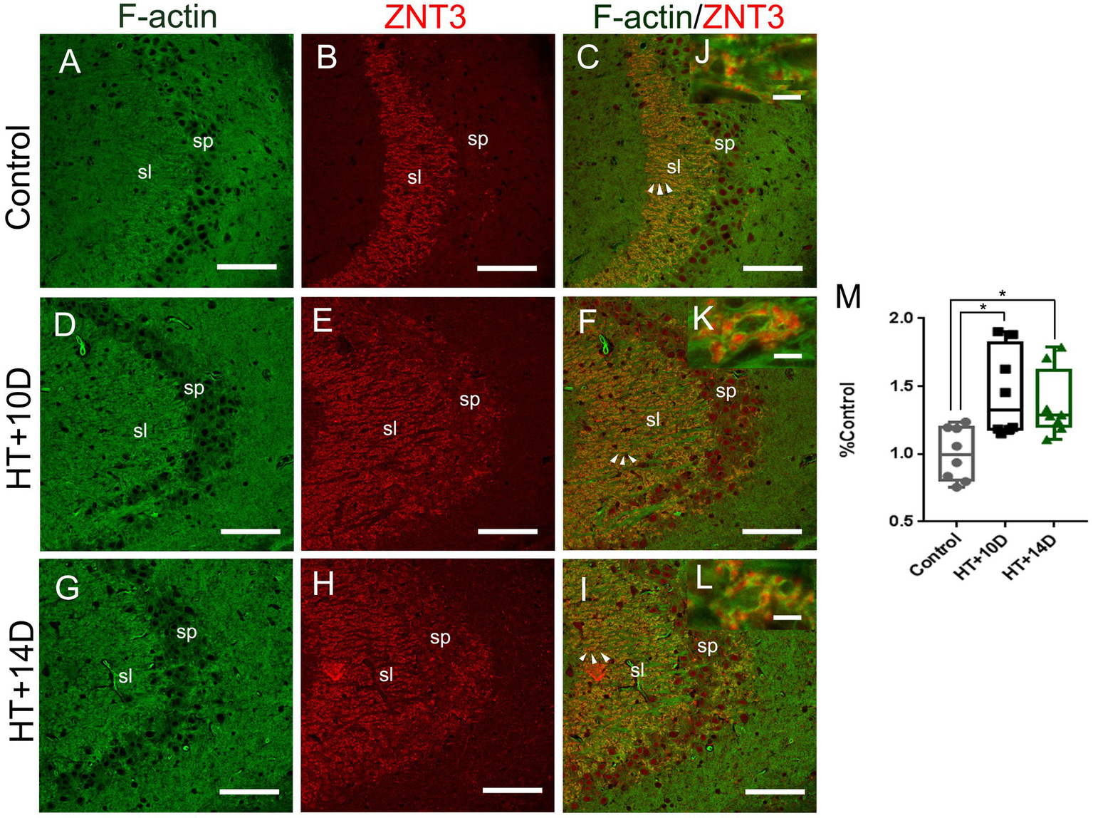 To examine whether there is correlation between the changes of F-actin cytoskeleton and LMTs, double labeling of phalloidin and ZNT3 was performed in different groups. It showed that the localization of F-actin was roughly the same as that of ZNT3 in CA3 stratum lucidum of hippocampus (Figures 4A-I). There was a dramatic increase of ZNT3 fluorescence intensity (Figures 4E,H) in the corresponding area where the intensity of F-actin was increased (Figures 4D,G) in HT + 10D and HT + 14D groups. Additionally, the enlarged images (Figures 4J–L) showed the puncta of ZNT3 were in close proximity to the puncta of F-actin (yellow), which indicated their co-localization. The relative overlapping area of F-actin and ZNT3 in each group was as follows: Control 1.00 (0.81, 1.19), HT + 10D 1.33 (1.18, 1.82), HT + 14D 1.27 (1.20, 1.61). Statistical analysis of overlapping area of F-actin and ZNT3 (yellow) showed a significant increase in both HT+ groups (Figures 4M) (*p1 = 0.03, *p2 = 0.02, n = 8 per group).