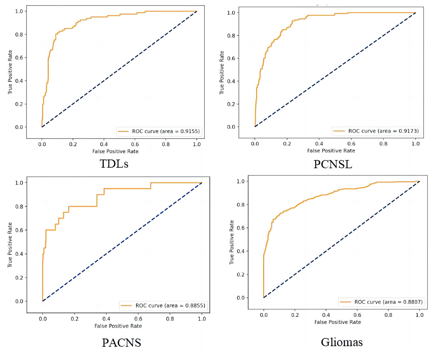 The CNN model had a total accuracy of 87% which was higher than senior neuroradiologists (74%), and the AUC of TDLs, PCNSL, TPACNS and gliomas were 0.92, 0.92, 0.89 and 0.88, respectively.