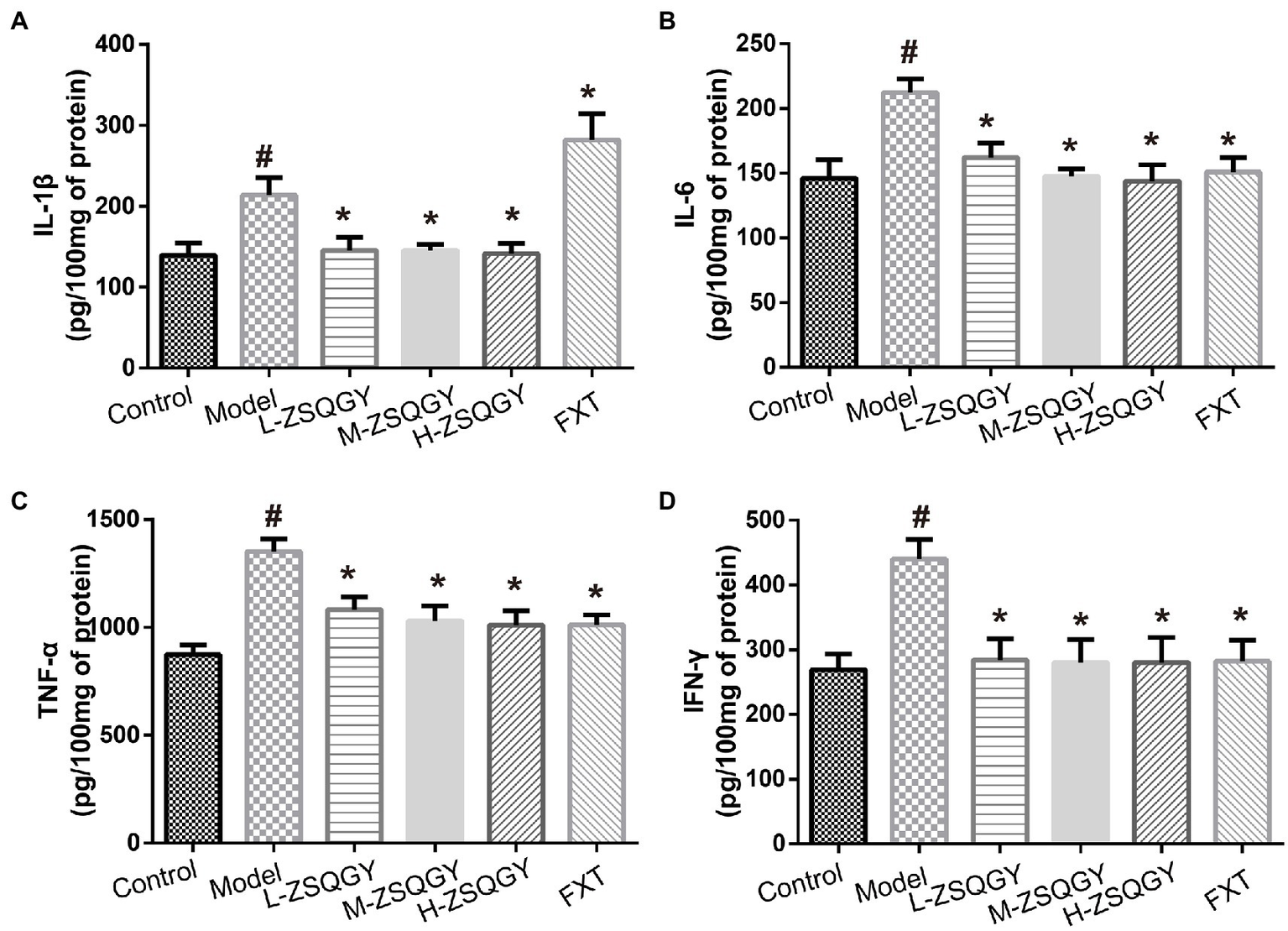 ZSQGY attenuated the level of inflammatory cytokines. (A) Level of IL-1β. (B) Level of IL-6. (C) Level of TNF-α. (D) Level of IFN-γ. Data are presented as mean ± SE. #p < 0.05 vs. control group. *p < 0.05 vs. model group (n = 6 in each group).