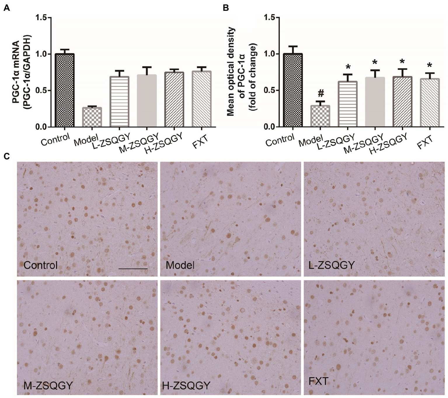 ZSQGY attenuated the reduction of PGC-1α in the MSG-induced depressive model. (A) Level of PGC-1α mRNA. (B) Mean optical density of PGC-1α. (C) IHC of PGC-1α. Data are presented as mean ± SE. #p < 0.05 vs. control group. *p < 0.05 vs. model group (n = 6 in each group).