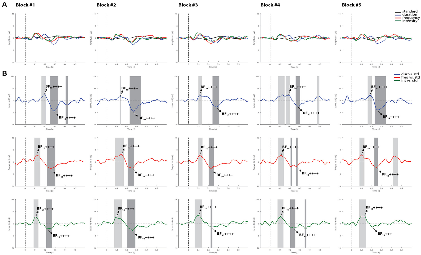 Individual ERPs and statistical findings of a representative control subject with the highest MMN detection rate. (A) Individual ERPs across blocks. (B) Time course of the difference between deviants and standard stimuli expressed in units of t-values. Significant intervals for negative components are denoted by a light gray area, and those for positive components are denoted by a dark gray area. Black arrows show the latency of maximum Bayes factors and the strength of evidence for H1: +, anecdotal; ++, moderate; +++, strong; ++++, very strong to extreme.